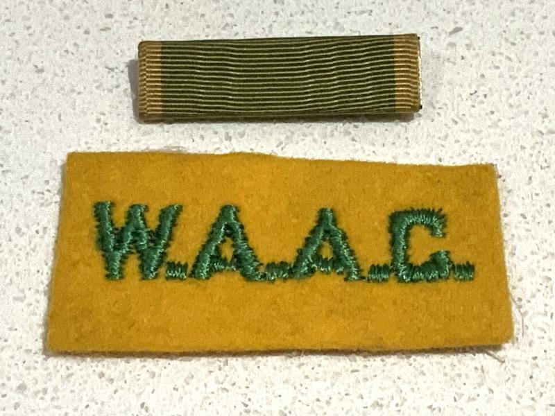 A WAAC Shoulder title embroidered on wool with a cheese cloth backing also included a WAC ribbon bar. Removed from collectors album see back image.The title 'WAAC' refers to a Women's Army Auxiliary Corps member. This was the original title for a U.S. military women's organization formed during World War II, but it transitioned into the Women's Army Corps (WAC) in 1943, which became a part of the regular Army. The change in 1943 granted WAAC members full military status, including equal rank and benefits with male soldiers.