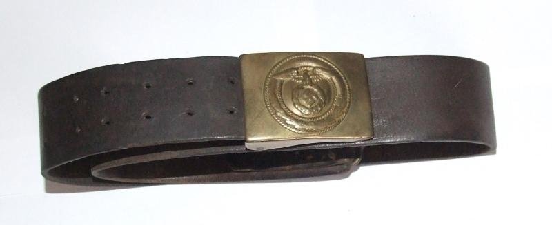 A belt and buckle for the Nazi Schturm Abteilung (SA).90cm dark brown leather belt with metal fittings. Brass buckle with smooth patina. SA eagle and swastika insignia in a laurel wreath