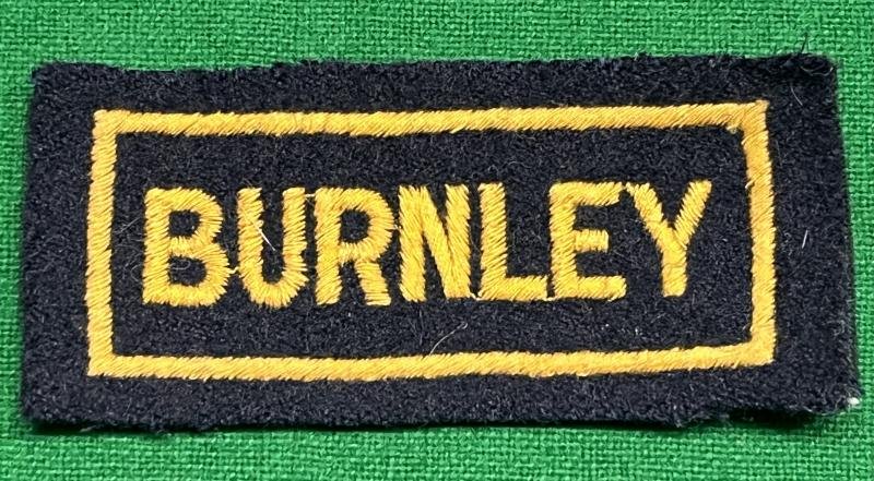 Gold on blue embroidered cotton on wool Civil Defence area title for Burnley, Lancashire . Worn on the breast pocket of the tunic below the CD breast badge. In good clean, used condition.