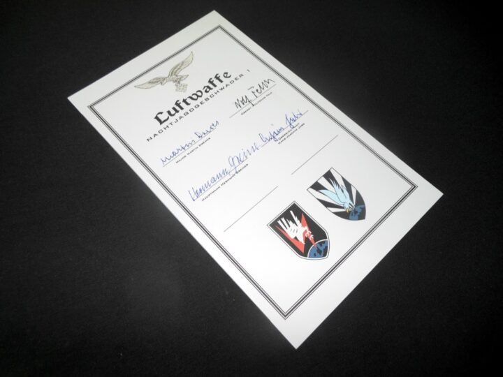 You are bidding on a FANTASTIC WW2 German Luftwaffe signed Grouping Card / Book Plate, featuring FOUR original hand-signed autographs of various night fighter pilots!Made of heavy card, this Book Plate is in SUPERB condition! A total of 6 signatures, this card consists autographs from NJG1 'Experten', including:Major Martin DrewesOberst Wolfgang FalkHauptmann Hermann GreinerOberleutnant Hans-Joachim JabsMeasuring approx. 5.5β³ x 8.5β³, it would make a PERFECT addition to any collection or display!