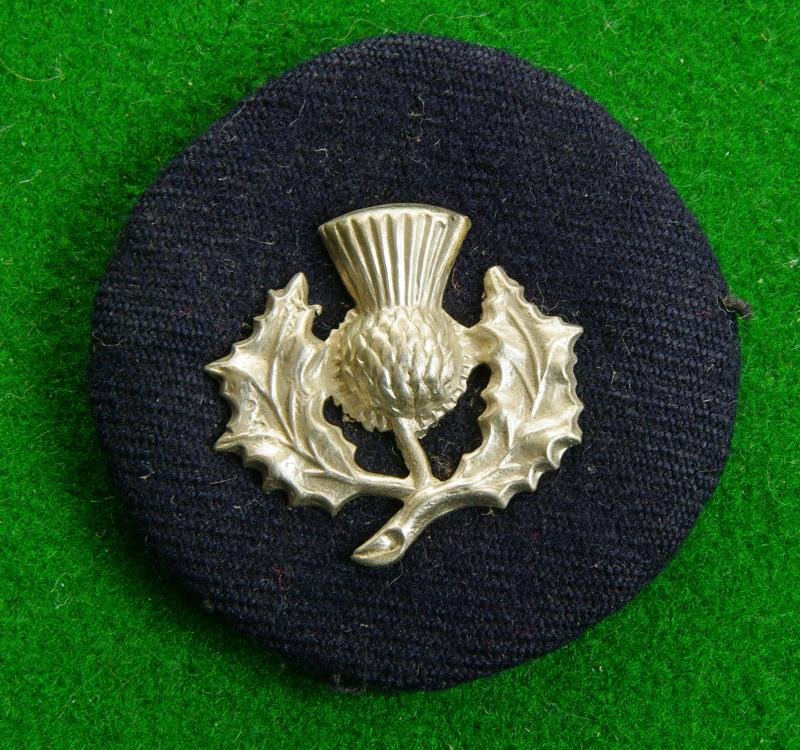 Scarce WW I white metal thistle backed by a piece of card on a circular dark blue backing.