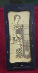 6 1/2 inches long and 2 3/4 inches across. The wooden frame has painted leaves with mother of pearl flowers. The frame is decorated on both sides, top and bottom. The reverse also has an embossed design with a silver piece across the back. It lookes like there was another plate at one time and it may have had stand affixed to the bottom.The picture inside is of a beautiful Geisha Girl holding a fan. Her kimono has a floral design. She holds a fan in one hand and the other rests on a bamboo divider. The glass is cracked across it but it has not damaged the image. This albumen image has been encased in this frame for a long time. Since it is sealed you would have to break it to get it open.
