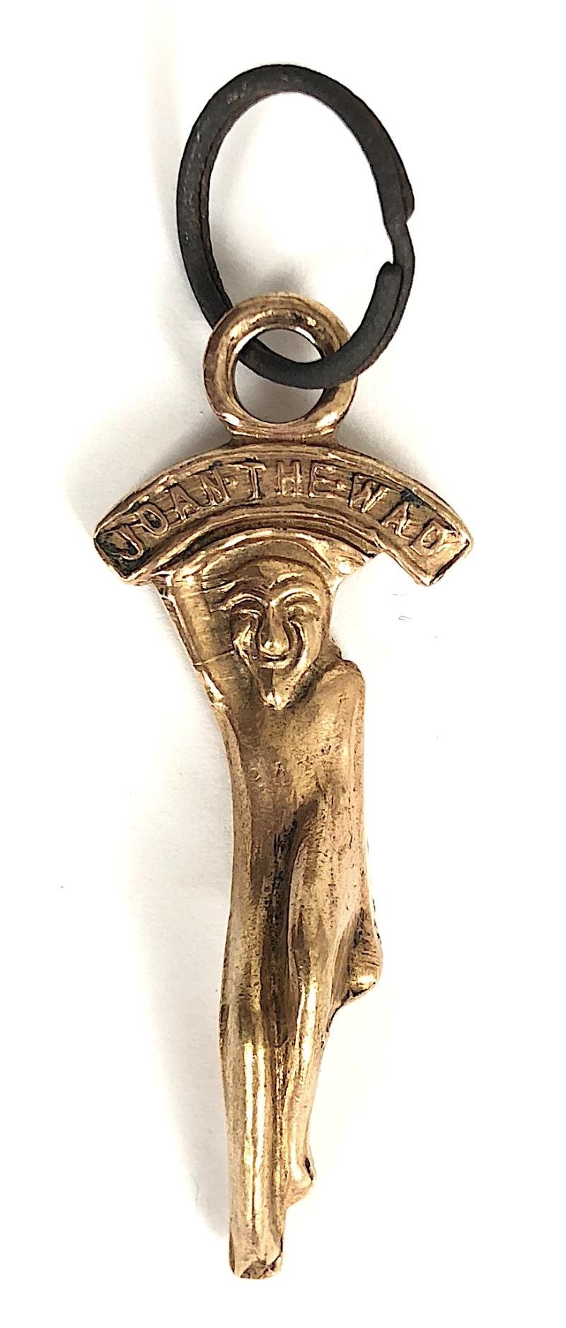 A good original circa early 20th century period 'Joan the Wad Queen of the Pixies cast brass pendant charm' with large loop to attach to key ring, chain, ribbon etc. the reverse is crudely stamped 'TRADE MARK No 529109' a Registration, Design and Patent for the year 1908. Good condition.Height approx 51mm.'Joan is thought to use her Wad (Torch) to light the way to safety and good luck'.