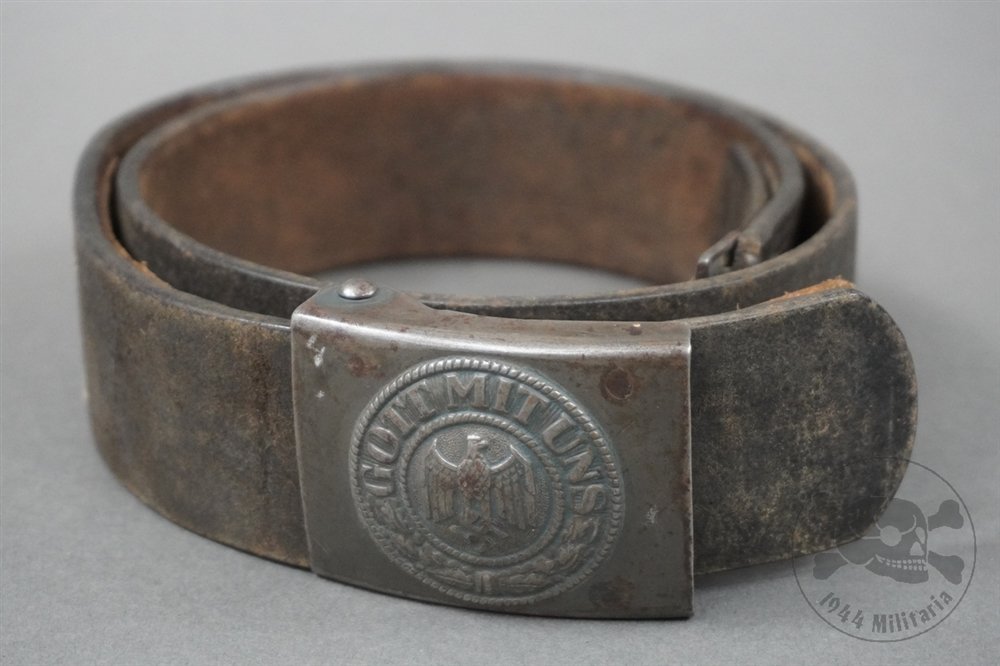 Original German WWII Steel Heer Buckle With Leather Combat Belt 92cm-The steel Heer buckle is paired with an original leather combat belt.Buckle: The buckle is Maker Marked 'B&N 1943', which indicates it was made by Berg & Nolte, of Ludenscheid, in 1943.Features a nice patina along with some rust, and retains sharp, well preserved details but is missing majority of the original factory paint on the front and retains about 80% on the back.Belt: The belt is faintly maker marked and dated 1941. The leather is still pliable and in excellent condition and is marked a size 92cm (approx. 36'). Does show some minor use.A solid, well-matched set, ideal for any collector of WWII German field gear.