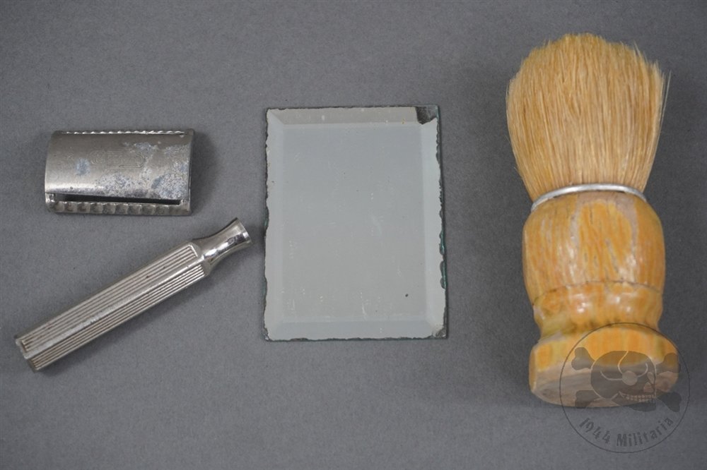 Original German WWII Various Shaving Kit ItemsThe items included are a broken razor, shaving brush, and pocket mirror. Unfortunately the razor is broken and we are not sure if it can be repaired or used for parts. The shaving brush still retains most bristles and the wood handle shows age. The mirror is still reflective but is missing some backing near the edge and two corners. There are tiny scratches and the edges are chipped.Sold as is.