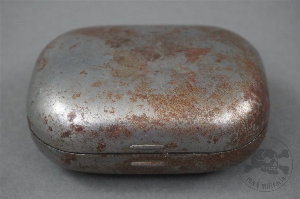 Original German WWII Soap Dish with Bar of Soap 'Hautschutz Seife'-This is an authentic German WWII metal soap dish with original wartime soap. The dish is constructed of stamped steel, showing age with surface rust / oxidation throughout but retaining its full form and function.Inside is a period bar of soap marked 'Hautschutz Seife' ('skin protection soap'), a type issued or privately purchased by soldiers for personal hygiene in the field. Soap and soap tins were essential hygiene items carried in rucksacks or breadbags, making this a classic example of German soldier's daily life equipment.Would work well for a German WWII personal items collection.