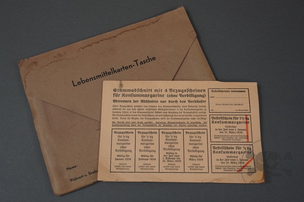 Original German WWII Ration Coupons With Envelope (Lebensmittelkarten-Tasche)Germany introduced rationing even before WWII (1939) in preparation for shortages.Every citizen received a Lebensmittelkarte-Tasche (food card), and families kept them in these special envelopes.The envelope had tab dividers for different categories of food and essential goods.The government used these to control distribution and encourage consumption of substitute products.These ration cards were issued in pre-war and wartime to organize ration coupons for various goods such as bread, meat, fat, milk/eggs, sugar, nutritional products, and soap. Only a seller could remove a coupon at time of purchase.This authentic example shows expected age toning and light wear but remains intact and legible—an excellent piece of everyday civilian history from the Third Reich era.
