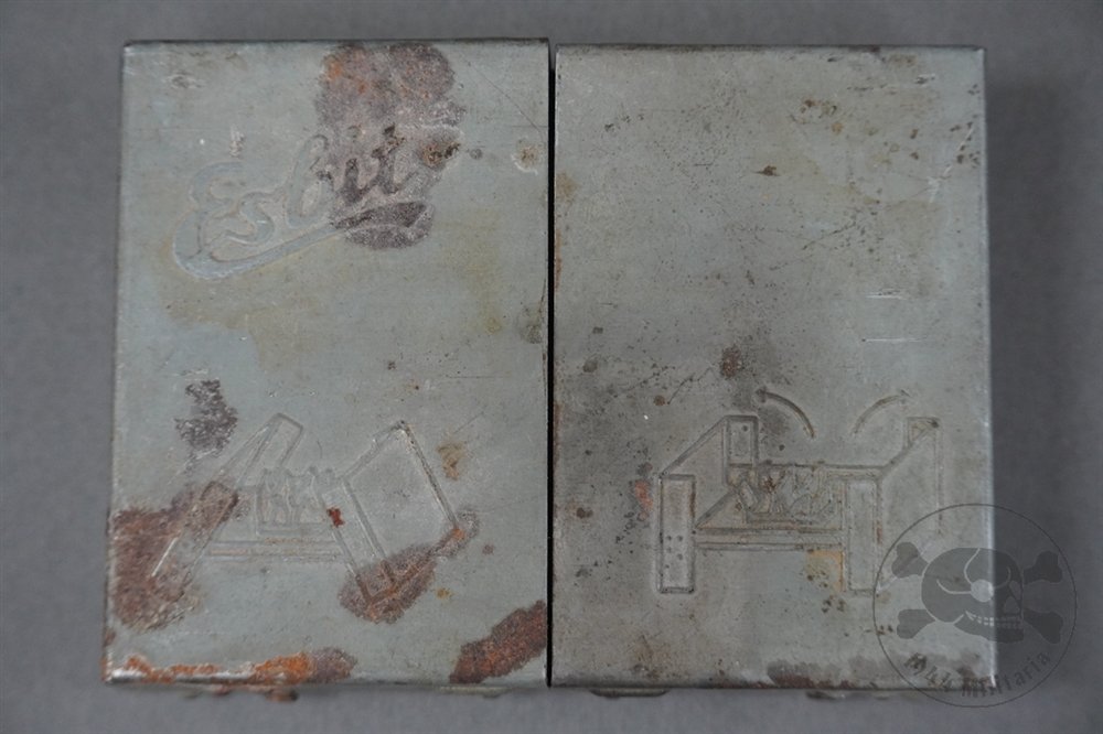 Original German WWII Esbit Stove (Fuel Not Included)The Esbit stove was a compact, folding field stove issued to German soldiers for heating rations, coffee, and soup while in the field. Made of stamped steel with hinged sides, it folded into a pocket-sized box for carrying and was fueled by small solid fuel tablets.This original example retains its embossed Esbit maker's mark on the lid. It shows service use with discoloration and heavy burn residue inside from actual fuel use. There is rust throughout. Hinges remain intact and functional. A classic piece of German field gear, perfect for reenacting or field equipment display.Please note: Esbit fuel not included.