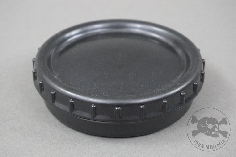 Original German WWII Black Bakelite Butterdish (Butterdose)An authentic German WWII Bakelite butterdish (Butterdose), the small round ration container issued to Wehrmacht and Waffen-SS soldiers as part of their mess kit. Designed with a quarter-turn locking lid, it was used to store butter, margarine, jam, or cheese rations in the field.This example is the scarcer black Bakelite variant, showing only minor surface scratches inside/out and remaining in very good condition. A desirable and practical piece of wartime field equipment for any collection.