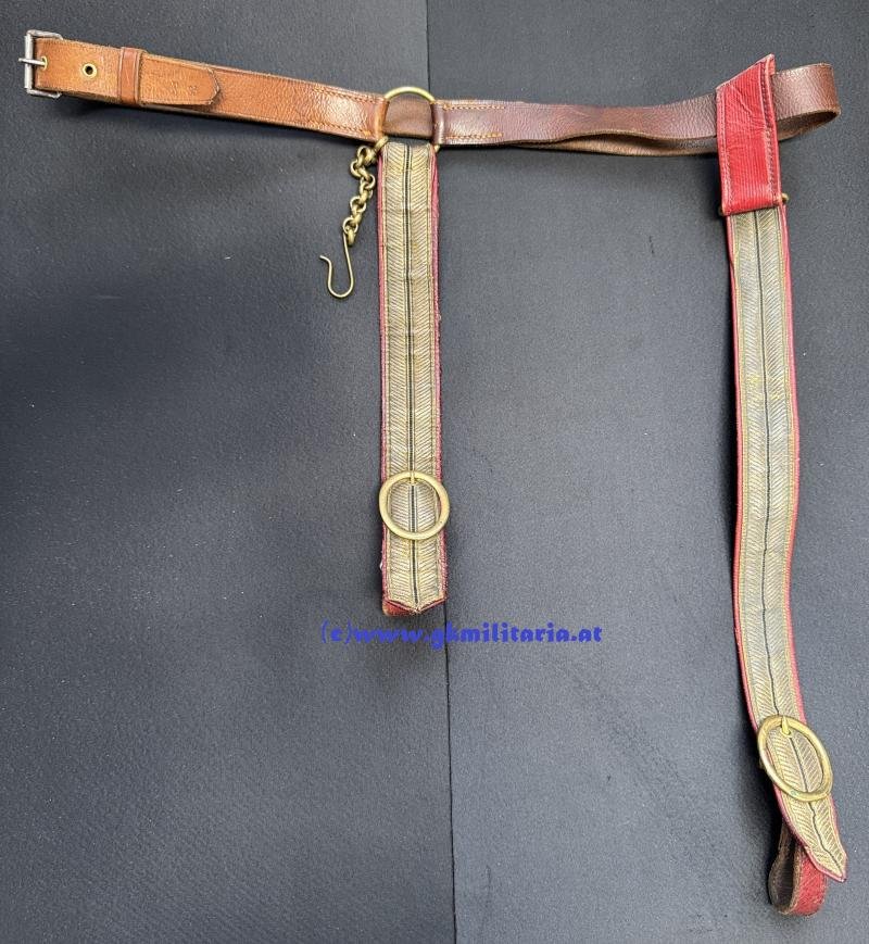 k.u.k. SĂ€belgehĂ€nge fĂŒr Offiziere!! - die 2 HĂ€nger fĂŒr den SĂ€bel mit Offiziersborte aus Goldgespinst und schwarzem Durchzug und auf RĂŒckseite mit rotem Safianleder belegt (der lange HĂ€nger ergĂ€nzt und oben geklebt) - dazu Kettensicherung fĂŒr den SĂ€bel - GĂŒrtel aus braunem Leder - guter gebrauchter Zustand!