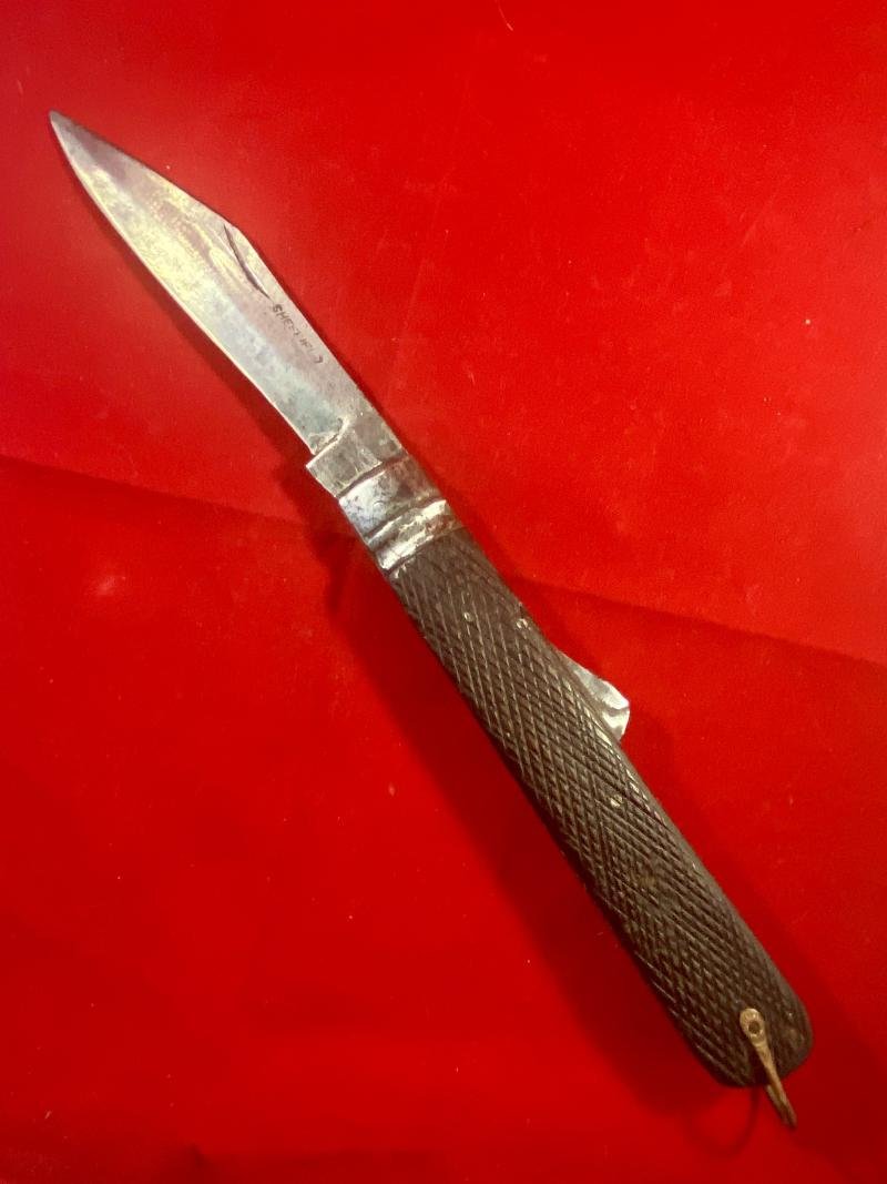 Here on offer is a large antique folding lock-back knife with chequered wood grip by Joseph Rodgers & Sons, circa 1880.I have owned this knife for many years but struggled to identify the maker. Whilst researching other knives I came across the stamped image of 'No 6' (an 'N' with a lower case 'o' above an underscore dash) which you can just make out stamped on the ricasso of this knife. Below the No6 you can just make out the word ENGLAND. This is the number for the famous Jospeh Rodgers & Sons address, No.6 Norfolk Street, Sheffield.The only other makings on the blade, is the word SHEFFIELD that is stamped on the front, near the nail pull. The knife has clearly seen a 'life' and the blade has been over cleaned, probably removing any other makers marks that may have existed?The clip-point blade is 5.25' long with a 4.75' cutting edge, that still holds a good edge with no visible nicks.It now shows some dark staining and light grinding marks to the finish and the tip has a sight curve.The blade pulls open easily and locks firmly in place amazingly, with no wobble, against the large steel bolster.Then to close the blade, you just push down on the semi-circular steel latch on the top edge of the grip, which releases the catch and it can be folded closed.The grip scales are made from wood, possibly oak that has been finished with a chequered pattern. They are in great condition with just some minor dings and a tiny slither missing from the top edge.They are pinned securely in place, to the steel liners by steel pins on both sides and at the end it retains a copper lanyard swivel loop.This knife is clearly not mint, but appears to be an unusual example of large lock back knife, by this famous Sheffield knife maker.The blade measures 5.25' (13.4cm) long with a cutting edge of 4.75' (12.2cm) and the knife itself is a total of 11.6' (29.5cm) long when open, excluding the lanyard loop.It weighs 150g.Please see my pictures for the details of the condition, which complement this description.Please see my TERMS OF BUSINESS regarding Deliver Charges and Insurance regarding additional insurance cover, should you require it, BEFORE the item is dispatched.The responsibility lies with the customer to check with your Customs restrictions that this item can be imported into your country.
