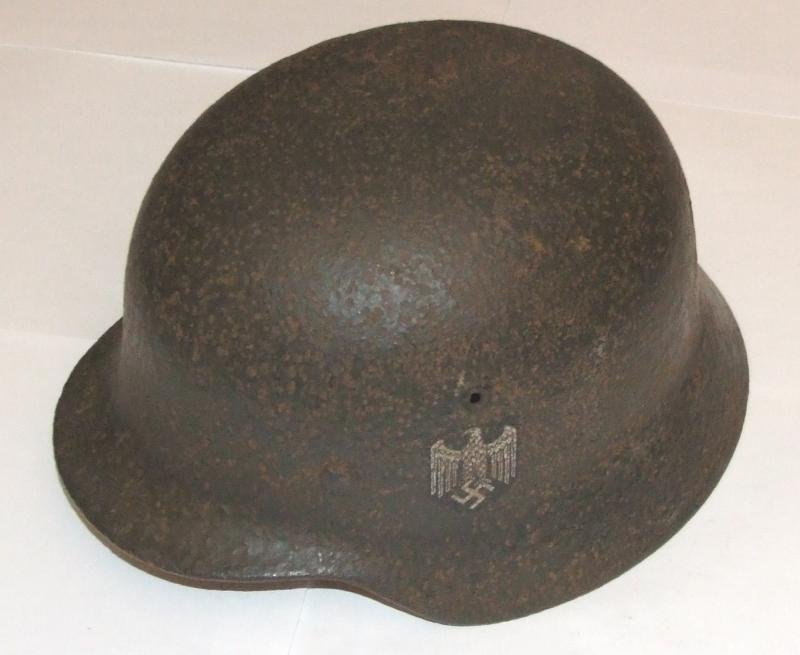 An Army M35 single decal helmet in fairly poor condition. Shell has severe pitting all over but is stable and shreds of green paint are still visible. Good Eagle and swastika decal but some pitting has leaked through in places. Screw-in M35 vents have become fused to shell. No visible size or makers marks, but probably a size 64. Hide liner intact. Chinstrap bales present but no chinstrap.