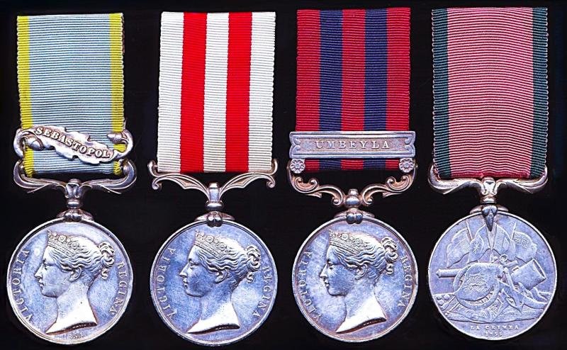 - Crimea Medal 1854. With clasp 'Sebastopol' (A. Holmes, 71st Regt.)- Indian Mutiny Medal 1857-1859. No clasp (Andrew Holmes, 71st Highlanders Lt. Iy.);- IGS 1854-1895 Medal. Silver issue with clasp 'Umbeyla' (3581 A. Holmes. H.Ms. 71st Regt.)- Turkey: Crimea Service Medal. Sardinia reverse. With British Crimea suspender (No. 3581 Andrew Holmes 71 Hd. Lt. Infy.)Note: The 3 x British campaign medals are all officially impressed, with the Turkish Medal engraved in a contemporary styleMedals and Clasps Verification: All medals and clasps confirmed as entitled, and as issued per below cited medal rolls- Crimea Medal 1854. With clasp 'Sebastopol': WO 100/31- Indian Mutiny Medal. With clasp 'Central India': WO 100/38- IGS 1854 Medal. Silver issue with clasp 'Umbeyla' WO 100/20- Turkey: Crimea Service Medal. With 'Sardinia' flag reverse: The recipients service papers in WO/97 file series refersAndrew Holmes was a native of the parish of Barony, Glasgow, Lanarkshire, Scotland, where he was born circa 1835. Andrew attested for the British Army at Glasgow, on 23 February 1853, on which date he was posted to the 71st Highlanders Regiment of Foot. At time of his enlistment he was 18 years of age, and described himself as having been a 'Baker' prior. In his subsequent military career, he racked up a total of 21 years and 39 days 'reckonable service towards pension' while 'Serving with the Colours', of which 17 years and 2 months - the majority of his service - was spent overseas as under;- Canada: 1 years 3 months- Crimea: 1 year 6 months- East Indies: 7 years 4 months- Mediterranean: 7 years 1 monthAndrew Holmes remained a 'Private' throughout his military career. He took his final discharge from the British Army on 29 June 1874, at which time he indicated that his intended place of future residence after leaving the army was to be:29 Carlisle PlaceNorton ParkEdinburghThe recipient service papers are extant and accessible in the file series WO/97 held at The National ArchivesCondition: GVF