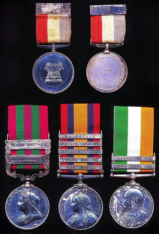 - IGS 1895-1902. 'Punjab Frontier 97-98' & 'Tirah 97-98 (3057 Pte. W. Greensall, 1st Bn. Som. Lt. Infy.)- QSA 1899-1902. 5 x clasps 'CC', 'TH', 'OFS', 'ROL' & 'Trans (3057 Pte. W. Greensall, Somerset Lt. Infy.)- King's South Africa Medal 1901-02. With 2 x dated clasps (3057 Pte. W. Greensall. Somerset L.I.)The IGS 1895 with single official correction to forename initial 'W', and the QSA with official correction to last 4 x letters of surname, and both exactly as issuedImportant: A highly distinguished regimental footballer, Greensall was Captain of the all conquering 1st Battalion Somerset Light Infantry regimental football team - of which he was 'Captain' and striking the winning goal in the Murree Brewery Cup Final of 1898 - having the previous year (1897) been a member of the 'Runners-Up' Murree Brewery Cup Final. Prior to that in 1896 William was a star player of the 'Light Bob's' regimental team that won the Duran Cup (beating the Black Watch). The Durand Cup being the oldest national footballing association cup in Asia, and still being played annually to sell-out crowds in India - the annual cup final being the highlight of the Indian Football Association season.'The Murree Brewery - is the oldest and now since 2021, one of only two licensed breweries and distilleries in PakistanThe Murree Brewery Cup was first contested in 1896, when it was won by the 1st Battalion Argyll and Sutherland Highlanders; in 1897 the trophy was won by the 1st Battalion Gordon Highlanders (who beat 'The Light Bobs' team including William Greensall in that year, while the final in 1898 was contested by 2nd Battalion Royal Scot and the 1st Battalion Somerset Light Infantry, the latter being the winners and another footballing trophy to the Durand Cup that they had earlier won in 1896Rare to regiment clasp: The 'Tirah 1897-98' clasp is extremely rare to the 1st Battalion Somerset Light Infantry - and only an estimated 17 x 'Tirah 1897-98' clasps issued to men of the battalion who served on attachment / secondment away from their parent battalion during the Tirah, North West Frontier campaigns of 1897-1898Medals & Clasps Verification: All 3 x medals confirmed as entitled per below following medals rolls and published sources- IGS 1895. 'Punjab Frontier 97-98' & 'Tirah 97-98: WO 100/86. For attached service 'Brigade Signaller'- QSA 1899-1902. 'CC', 'TH', 'OFS', 'ROL' & 'TR': WO 100/175- King's South Africa Medal 1901-02. With both dated 'South Africa' clasps: WO 100/323Durand Cup Winners Medal: The recipients important 'Durand Cup' winners medal is known to be extant, having been listed for sale at the saleroom of London Auction House Dix Noonan Wood, on 15 March 2011 as Lot 1631 with the following illustrated catalogue description: India, Durand Football Challenge Prize, a silver award medal, unsigned, view of buildings, trees and hills in background, rev. legend around wreath, named (1 The P.A. Som. L.I. No. 3057 Pte. Greensall, 1896), 57mm (Pudd. 1987 970.12). Cleaned in the past, otherwise extremely fine and very rare; in maroon fitted case (this partially warped)The British sporting legacy, courtesy of generations of service by the British Army in India, morphed into formal regional and national sporting associations throughout the sub-continent, many of which still flourish in 2025, as evinced by the annual Durand Cup competition run by the Indian Football AssociationWilliam Greensall was a native of the parish of Aston, Birmingham, Warwickshire, England, where he was born circa 1872. By trade a 'Wire Drawer' he was 18 years & 2 months of age, when he enlisted in the British Army, at, Birmingham, England, on 5 January 1891, on which date he was posted to the Somerset Light Infantry and given the regimental number number '3057'. He was sent to the Regimental Depot for basic training, after which he was posted to the 1at Battalion Somerset Light Infantry on, 19 May 1891. By the time William took his final discharge from the British Army on 4 January 1903, he had accumulated 12 years service towards pension. William's service papers show that most of his army career was spent overseas including periods of active campaign service on the North West Frontier of India 1897-98, and later during the South African War. William record of service with the British Army is summarised below:- Home: 05/01/1891 - 08/11/1891 (308 Days)- Gibraltar: 09/11/1891 - 18/12/1893 (2 Years 40 Days)- East Indies: 19/12/1891 - 28/12/1898 (5 Years 10 Days)- Home: 29/12/1898 - 03/11/1899 (310 Days)- South Africa: 04/11/1899 - 13/03/1902 (2 Years 130 Days)- Home: 14/03/1902 - 04/01/190 (297 Days)The recipients British Army service papers - an excellent set - are extant and accessible at The National ArchivesA most desirable British India medal group, with rare to regiment clasp combination to soldier who led his regimental football team to considerable success in the early history of football being played in IndiaCondition: Mostly dark toned GVF