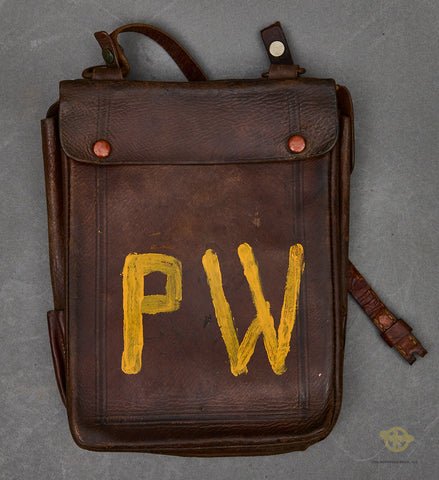 WWII Japanese Officer's Map Case for POW-This is the hard-shell brown leather version with hand stitched 5-pointed star on front flap. There is kanji handwritten under the flap, so this could be a name. The fittings are made of brass. This measures 11 inches (27.94cm) long by approx. 8 ½ inches (21.59cm) wide. The front has a slot for paperwork or maps. There is also a flap on the reverse with a second pocket which is unusual. The leather is in good condition and is very nicely toned. It could use some conditioning. There is a broken brown leather shoulder strap with adjustable buckle. This is broken so be sure to look at the photos. The interesting part of this bag is the yellow painted PW on the reverse of the bag, indicating this bag was owned by a prisoner of war. They allowed this POW to keep his bag, maybe for his personal effects?This is a good-looking piece with a lot of history.