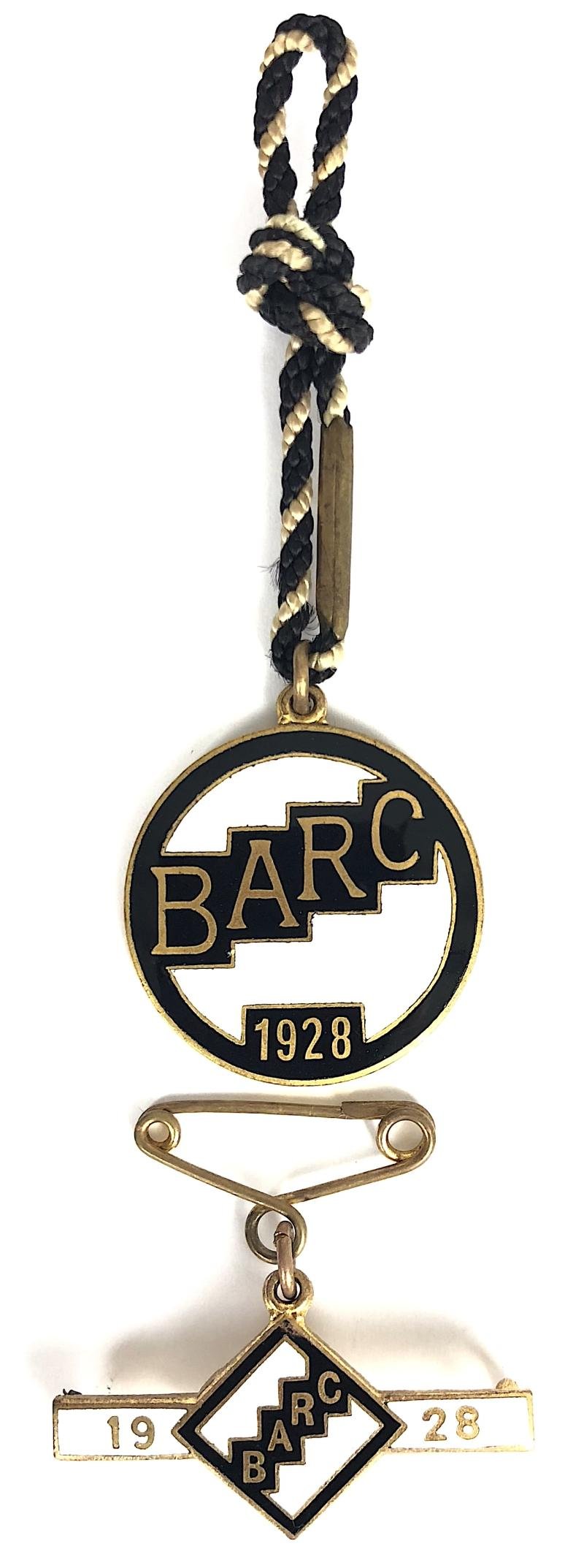 A rare original early period '1928 Brooklands Automobile Racing Club pair of gilt and enamel badges, the reverse of each with maker's details 'W.O.Lewis (Badges) Ltd Birmingham' and with official issue 'No 40A and embossed 'Brooklands Automobile Club'. Very good condition, complete with original cord and pin fittings, no damage to the enamel.