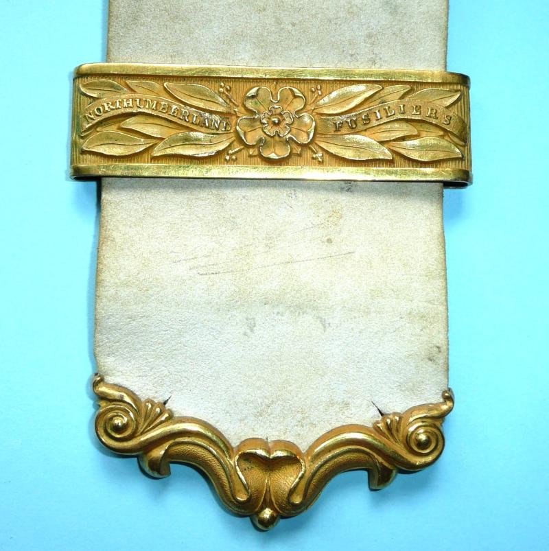 A fire gilt version of the slide and belt end (the drummer's pattern was in gilding metal) as attached to the Ensign's belt used to carry the King / Queen's Colour and Regimental Colour, and possibly also the Drummer's Colour (unique to the Northumberland Fusiliers and carried on St George's Day). A fairly unique collectable to the Regiment.Col D R Wood ('Fifth Fusiliers and Its badges' (2nd Edn)) Fig 488 refers.Comm JoPa
