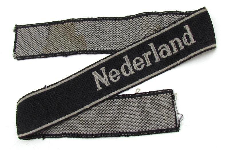 Waffen-SS BeVo-woven 'Nederland' cufftitle (Ärmelband).This is the Fourt and last pattern cufftitle as intended for members of the 'SS-Freiwilligen-Panzergrenadier-Brigade Nederland', woven in grey/white thread on black in the so-called 'BeVo' weave, the back of the cufftitle shows the salt-and-pepper design. The cufftitle shows the woven script 'Nederland'. The cufftitle is in full length condition with typical unfinished ends and measures approximately 43cms in length.The cufftitle is in good unissued condition showing some staining and traces of years of storage
