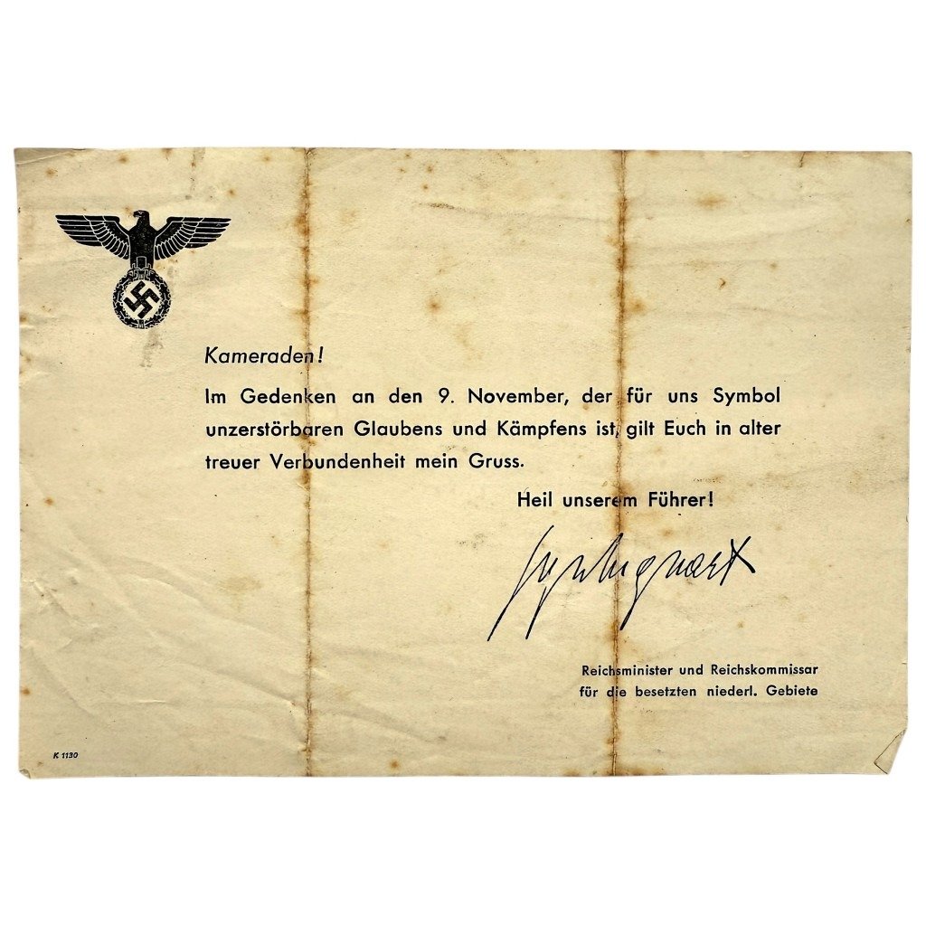 This German document from the Second World War was issued by Arthur Seyss-Inquart, Reich Minister and Reich Commissioner for the occupied Dutch territories.The piece commemorates November 9th, the day which in the Third Reich was regarded as a symbol of 'indestructible faith and struggle' and was ceremonially remembered each year.At the top it features the eagle with swastika, at the bottom the printed name and function of Seyss-Inquart, with print number K 1130.The text concludes with the typical salute 'Heil unserem Führer!'.An interesting item for any Second World War collection!Article number: 16675