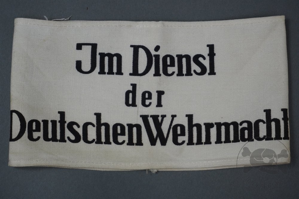 Original German WWII 'Im Dienst der Deutschen Wehrmacht' ArmbandThe white printed Im Dienst der Deutschen Wehrmacht ('In Service of the German Armed Forces') armband was introduced on 1 October 1941 for wear by non-German civilians serving the Armed Forces and for Russian Auxiliaries when not in uniform. The armband was worn on the upper left sleeve. These were necessary to identify the growing sector of non-uniformed personnel serving in a military capacity with a branch of the German armed forces. Often, these were worn by men of the Reichsarbeitsdienst and Reichsbahn who were operating with the German Army in the occupied countries.This black lettered screen printed armband on a white cotton/rayon material is unmarked and shows light discoloration and toning. Overall unissued and in excellent condition.