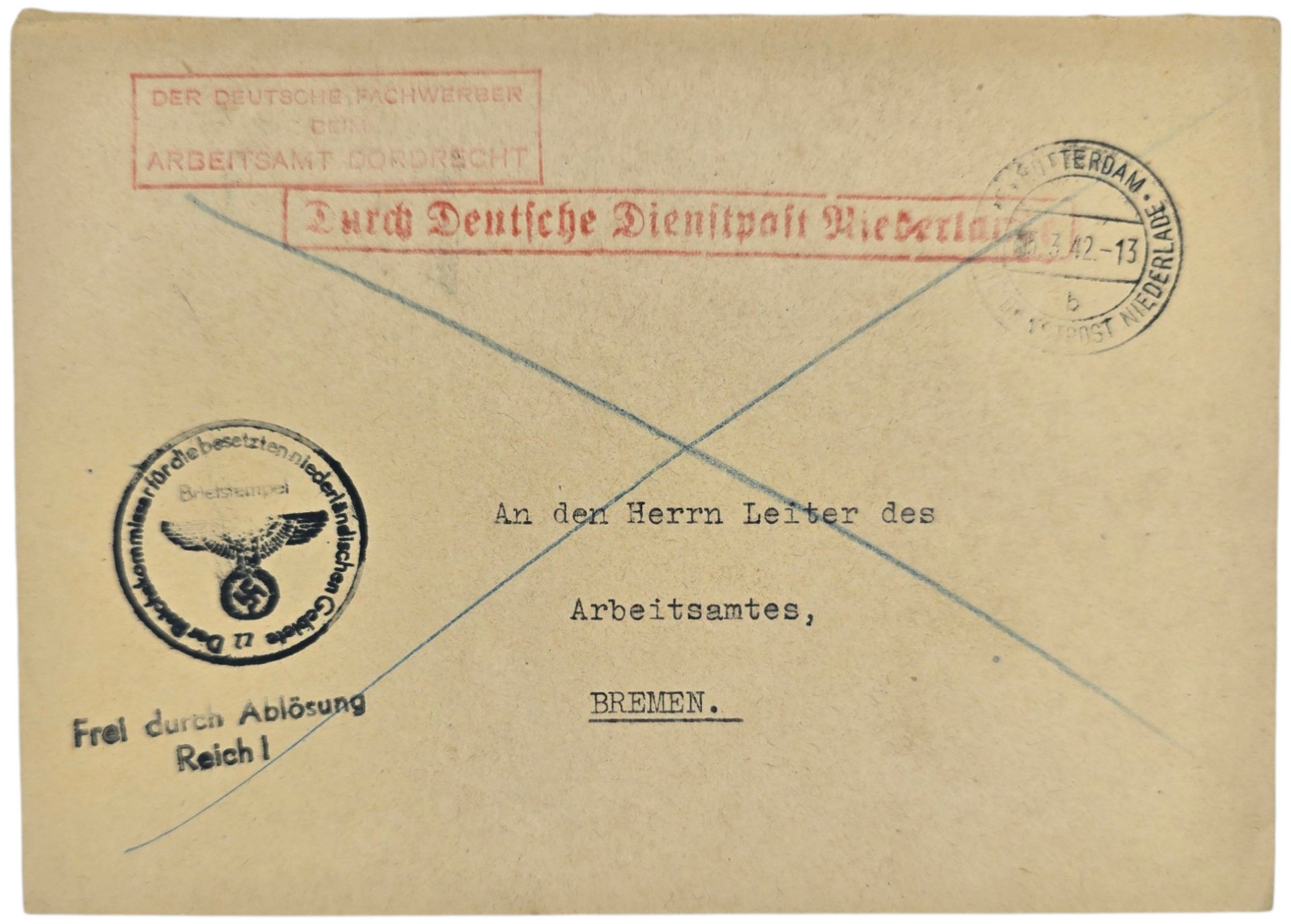 Original WW2 Dutch Document - Envelope Reichskommissar, Arbeitsamt Dordrecht, Bremen (1942)