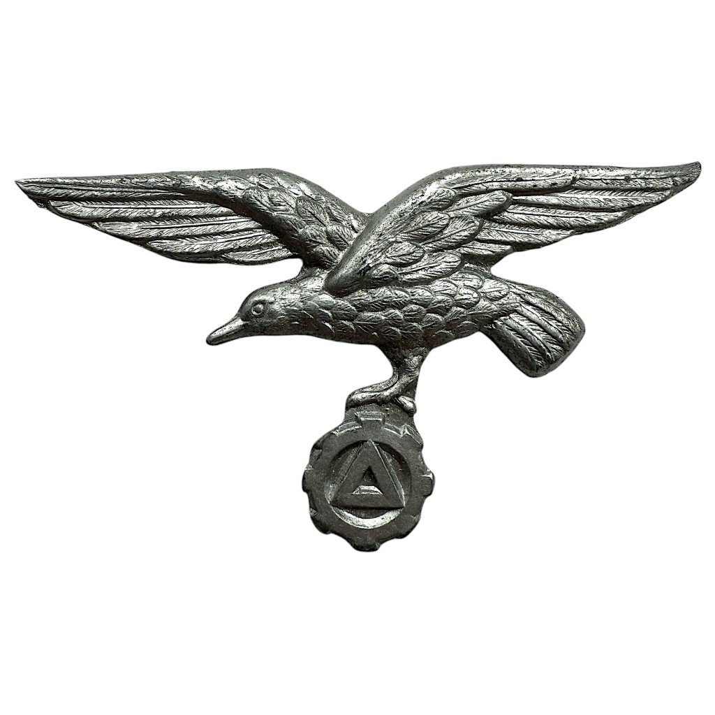 This Flemish collaboration VNV (Vlaamsch Nationaal Verbond) metal visor cap eagle from the Second World War is in good condition and executed in grey-colored metal.The design shows a detailed eagle with outstretched wings holding a cogwheel, in which the triangular symbol of the Flemish National Union is incorporated.The reverse is fitted with the original attachment prongs, with which the insignia was worn on the cap.An interesting emblem for any Flemish collaboration or Second World War collection!Article number: 16700Originele WWII Vlaamse VNV metalen pet adelaarDeze Vlaamse collaboratie VNV (Vlaamsch Nationaal Verbond) metalen petadelaar uit de Tweede Wereldoorlog verkeert in mooie conditie en is uitgevoerd in grijskleurig metaal.Het ontwerp toont een gedetailleerde adelaar met gespreide vleugels die een tandrad vasthoudt, waarin het driehoekssymbool van het Vlaams Nationaal Verbond is verwerkt.De achterzijde is voorzien van de originele bevestigingspinnen, waarmee het embleem op de pet werd gedragen.Een interessant embleem voor de Vlaamse collaboratie of Tweede Wereldoorlog collectie!