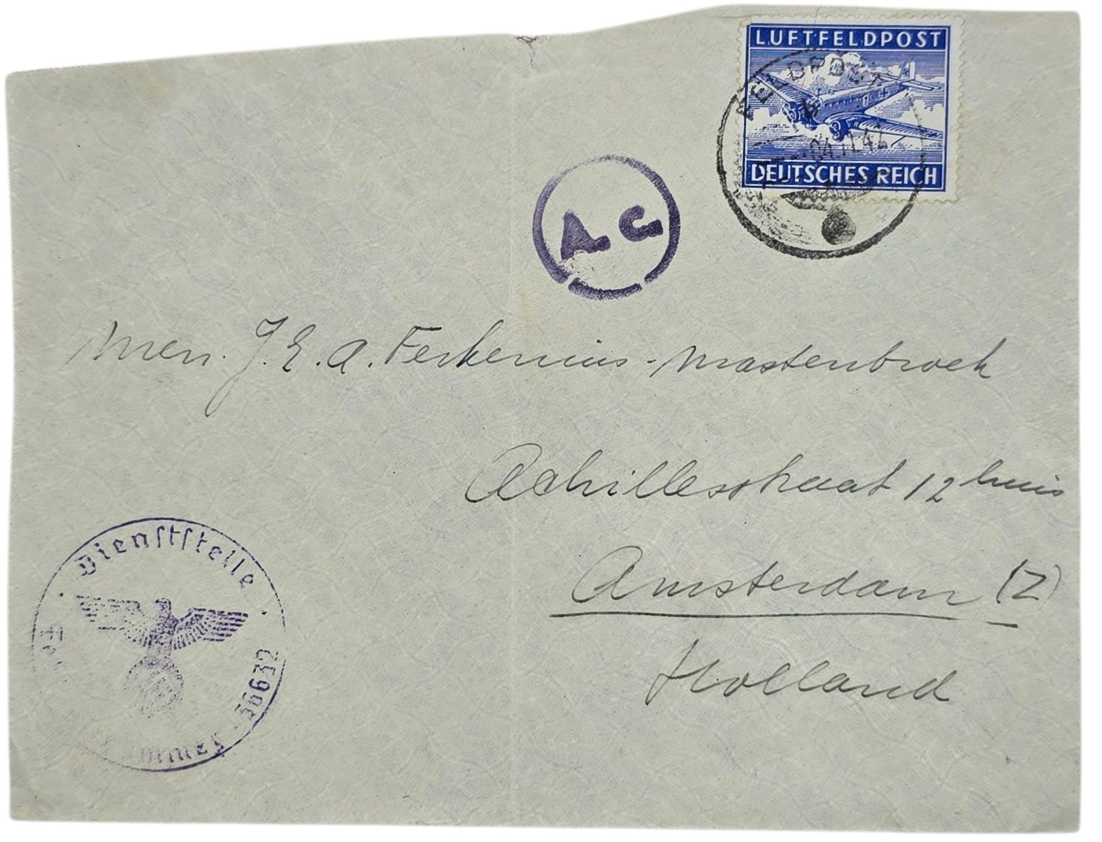 Original WW2 Dutch Waffen SS Document - Envelope Dutch Waffen SS volunteer SS-Kavallerie Brigade (1942)Feldpostnummer 366332: 2. Kranken-Kraftwagen-Zug SS-Kavallerie-Brigade.With a Wolfsangel on the backside. The envelope is open on the topside and the left side.Origineel Wo2 Nederlands Waffen SS Document - Envelop Nederlandse Waffen SS vrijwillger SS-Kavallerie Brigade (1942)Feldpostnummer 366332: 2. Kranken-Kraftwagen-Zug SS-Kavallerie-Brigade.Met een Wolfsangel op de achterkant. De envelop is aan de boven- en linkerkant open.