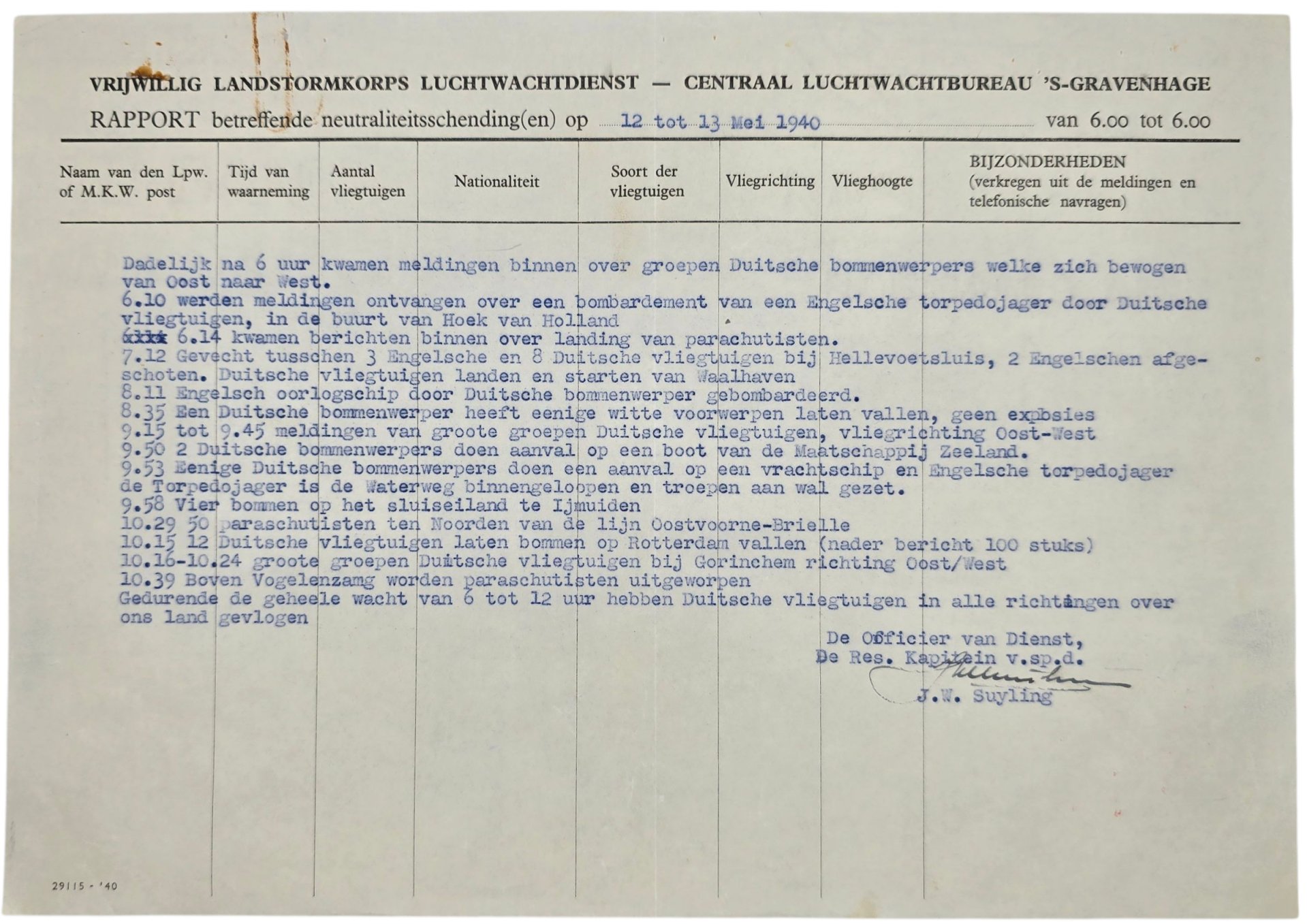 Original WW2 Dutch Document - Dutch Army Luchtwachtdienst air watch service report The Hague, 12th & 13th of May (1940)Interesting document from the Vrijwillige Landstormkorps Luchtwachtdienst at the bureau in The Hague ('s Gravenhage) that reported on the German invasion of the Netherlands by air. These are timed with what the groups saw during the period, like crashing airplanes and shooting in different areas. Also, sightings of fallschirmjägers were reported.This document mentions the following towns: Hoek van Holland, Hellevoetsluis, Waalhaven (Rotterdam airfield), Maatschappij Zeeland, Waterweg, IJmuiden, Oostvoorne, Brielle, Rotterdam, Gorinchem & Vogelenzang.Signed by Captain J. W. Suyling.Origineel Wo2 Nederlands Document - Rapport van de Luchtwachtdienst van het Nederlandse Leger in Den Haag, 12 en 13 mei (1940)Interessant document van het Vrijwillige Landstormkorps Luchtwachtdienst op het bureau in Den Haag ('s Gravenhage) dat berichtte over de Duitse invasie van Nederland door de lucht. Deze zijn getimed met wat de groepen gedurende de periode hebben gezien, zoals neerstortende vliegtuigen en schieten in verschillende gebieden. Ook werden waarnemingen van Fallschirmjägers gemeld.In dit document worden de volgende plaatsen genoemd: Hoek van Holland, Hellevoetsluis, Waalhaven (vliegveld Rotterdam), Maatschappij Zeeland, Waterweg, IJmuiden, Oostvoorne, Brielle, Rotterdam, Gorinchem & Vogelenzang.Ondertekend door kapitein J.W. Suyling.