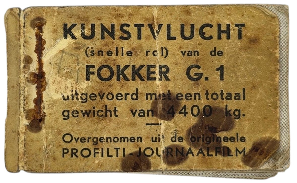 Original WW2 Dutch Document - Flipbook ''Kunstvlucht van de Fokker G1'' airplaneExtremely rare flipbook of a Dutch LVA Fokker G-1 (Wasp) airplane doing a barrel roll. This flipbook was published by the Fokker factory in Amsterdam to promote their airplane. The staple was removed because of rust.Origineel Wo2 Nederlands Document - Flipboek ''Kunstvlucht van de Fokker G1'' vliegtuigExtreem zeldzaam flipboek van een Nederlands LVA Fokker G-1 (Wasp) vliegtuig dat een barrel roll maakt. Dit flipboek werd uitgegeven door de Fokkerfabriek in Amsterdam ter promotie van hun vliegtuig. De nietjes waren verwijderd vanwege roest.