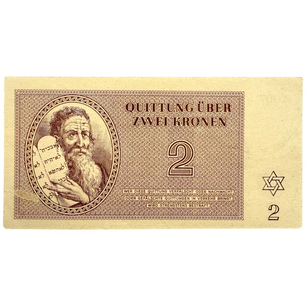 This 2 Kronen banknote was issued in the Theresienstadt (Terezín) ghetto and concentration camp during the Second World War.Issued in 1943, it was part of the internal camp currency system and had no value outside the ghetto.The obverse depicts a detailed portrait of Moses holding the stone tablets with Hebrew inscriptions, along with the denomination '2 Krone' and a Star of David.The reverse features ornate lettering with the text 'Quittung über Zwei Kronen' (Receipt for Two Kronen), dated January 1st, 1943, and signed by the 'Älteste der Juden in Theresienstadt' (Elder of the Jews in Theresienstadt).The banknote is well-preserved and shows crisp details.Article number: 16706