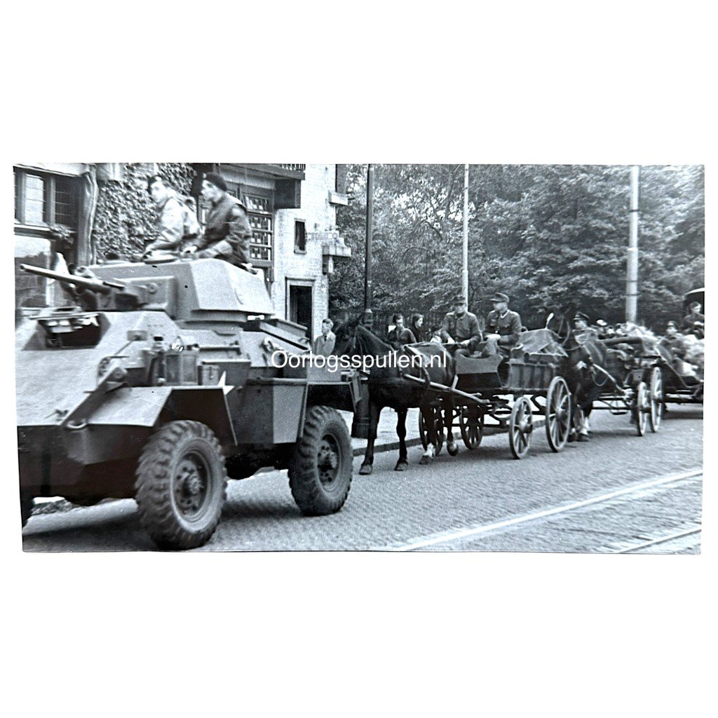 This Dutch photo from May 1945 was taken in Amsterdam shortly after the German capitulation.The image shows the retreat of German troops with horse-drawn wagons, escorted by an Allied (Canadian) armored car.Dimensions: 19.5 x 11 cmArticle number: 16712Originele WWII Nederlandse foto aftocht Duitse soldaten met Canadese troepen in AmsterdamDeze Nederlandse foto uit mei 1945 werd gemaakt in Amsterdam kort na de Duitse capitulatie.De opname toont de aftocht van Duitse troepen met paard en wagen, begeleid door een geallieerd (Canadees) pantserwagen.Afmetingen: 19.5 x 11 cm.