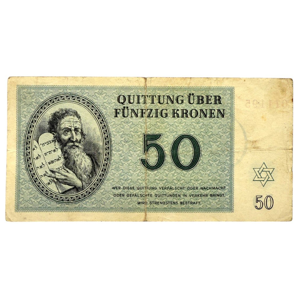 This 50 Kronen banknote was issued in the Theresienstadt (Terezín) ghetto and concentration camp during the Second World War.Issued in 1943, it was part of the internal camp currency system and had no value outside the ghetto.The obverse depicts a detailed portrait of Moses holding the stone tablets with Hebrew inscriptions, along with the denomination '50 Kronen' and a Star of David.The reverse features ornate lettering with the text 'Quittung über Fünfzig Kronen' (Receipt for Fifty Kronen), dated January 1st, 1943, and signed by the 'Älteste der Juden in Theresienstadt' (Elder of the Jews in Theresienstadt).The banknote is well-preserved and shows crisp details.Article number: 16721