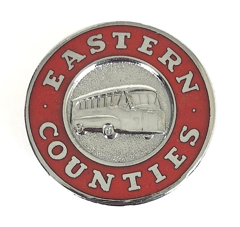 A good original late issue circa 1960's period 'Eastern Counties Omnibus Company Ltd cap badge'; chromium plated red enamel title circlet embossed single decker bus to centre on seeded ground. Very good condition, complete with original two loop fittings now slightly bent and split pin, no stress marks or enamel loss, light surface scratches only.Diameter approx 34mm.