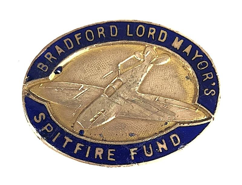 A scarce original Second World War period 'Bradford Lord Mayor's Spitfire Fund lapel badge'; gilt brass oval, blue enamel title surround, the centre depicting an embossed Royal Air Force Spitfire Plane, the reverse impressed with maker's details 'FATTORINI BRADFORD'. Very good condition, complete with original buttonhole fitting, enamel intact with minor service wear.Size approx 26 x 19mm.
