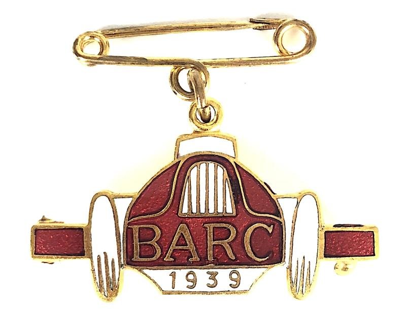 A very scarce original '1939 Brooklands Automobile Racing Club gilt and enamel pin badge' well designed in the form of a racing car, the reverse with embossed maker's details 'W.O.LEWIS (BADGES) Ltd Birmingham' and official issue 'No 591'. Excellent condition, complete with original pin fittings, enamel perfect, gilt remains bright.Width approx 34mm.
