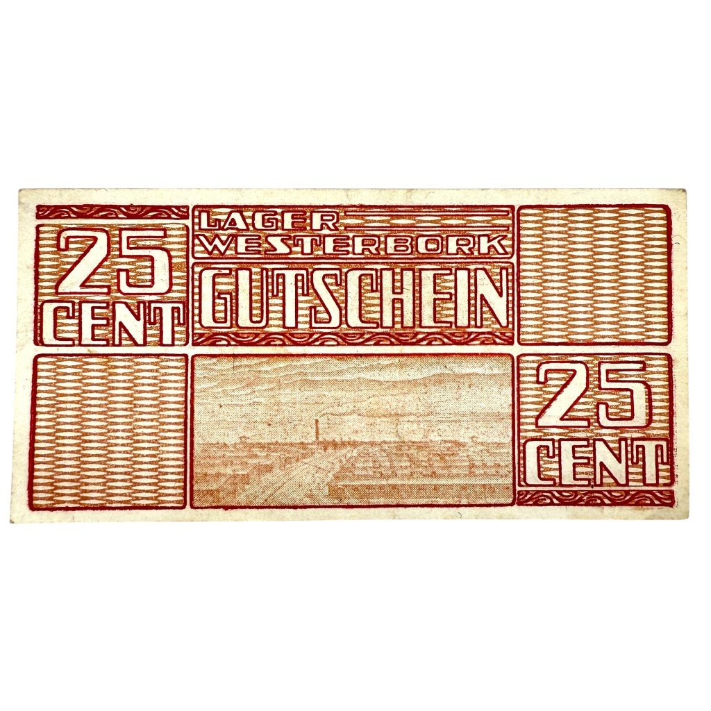 The banknote is in used condition and is dated with 1944.This is a 25 cent banknote that was used in 'durchgangslager' camp Westerbork during World War II.Camp Westerbork was a transit camp in the northeastern part of the Netherlands during World War II.The camp was initially set up by the Dutch government in 1939 to accommodate Jewish refugees who had fled from Germany.However, after the German occupation of the Netherlands in 1940, the camp was taken over by the Germans and became a transit camp for Jews who were being deported to extermination camps in Eastern Europe.From 1942 to 1944, nearly 107,000 Jews were transported from Westerbork to concentration and extermination camps such as Auschwitz-Birkenau and Sobibor.The camp was also used to house political prisoners, Jehovah's Witnesses, and Roma people. The last train to leave Westerbork was on September 13, 1944, and the camp was liberated by Canadian forces on April 12, 1945.The Jewish inmates had to change their money for the camp money when they arrived and it was possible to buy small goods at the so-called Lagerhaus in the camp.A unique object for the World War II collection or for a museum.Article number: 16772