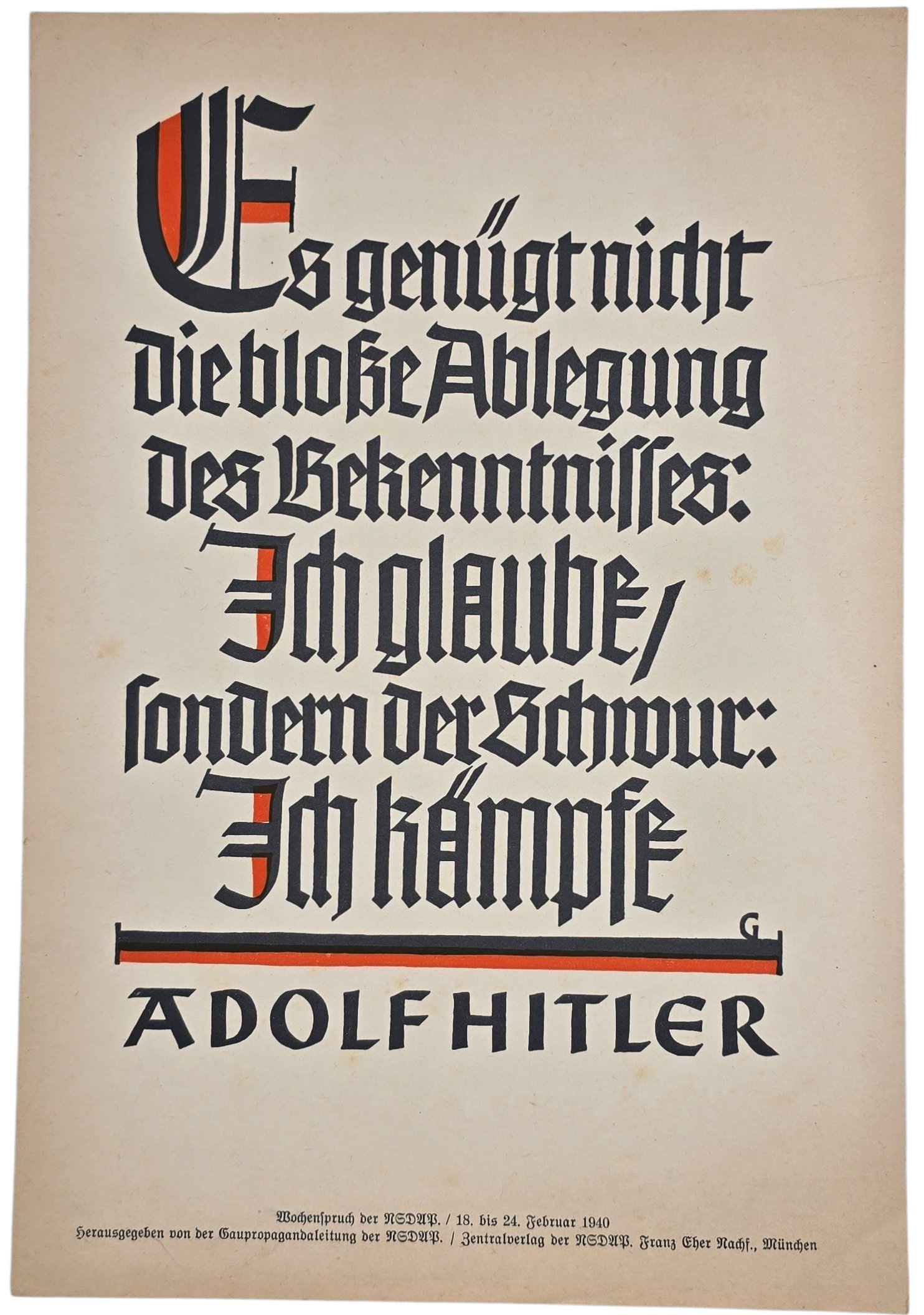 Original WW2 German Poster - NSDAP Wochenspruch folge 18 Februar, Adolf Hitler (1940)Approximately 35 x 24 cm„Es genügt nicht die bloße Ablegung des Bekenntnisses: Ich glaube, sondern der Schwur: Ich kämpfe. – Adolf Hitler''Originele Wo2 Duitse Poster - NSDAP Wochenspruch folge 18 Februar, Adolf Hitler (1940)Ongeveer: 35 x 24 cm„Es genügt nicht die bloße Ablegung des Bekenntnisses: Ich glaube, sondern der Schwur: Ich kämpfe. – Adolf Hitler''