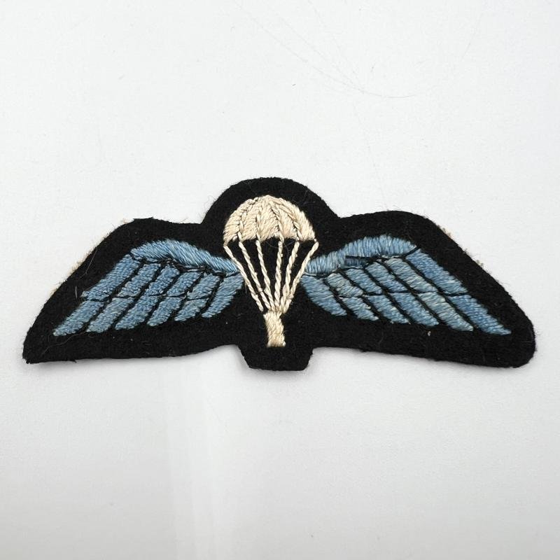 Very rare British made wing. Black backing, blue wings and white parachute. This pattern of wing is most commonly associated with 156th Battalion Parachute Regiment, No 2 Commando and Special Operations Executive. Most surviving examples are in unused condition.