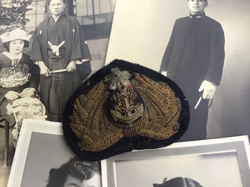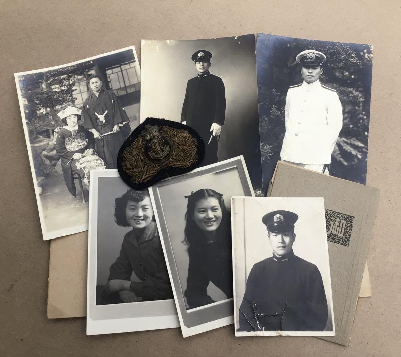 A nice selection of personal photographs of an Imperial Japanese naval officer and his wife.Small photo in card cover of the officer in uniform, the reverse with hand written text. 110mm x 75mm.Two studio photographs of presumably his wife130mm x 85mm with written text to the reverse.Photograph of the officer and wife dressed in traditional civilian dress , possibly their wedding day. 155mm x 105mm.Studio photographs of presumably of the officer in winter uniform , full length shot wearing dagger and in card cover. 155mm x 105mm.Photograph of the officer in white summer uniform again with dagger. 155mm x 105mm.All together with the officers bullion embroidered hat badge.A lovely display lotInterestingly enough if you havnt tried it, I put the image of the Japanese text into Googles translation app and it's translated the back of the photos, see extra pictures attached.