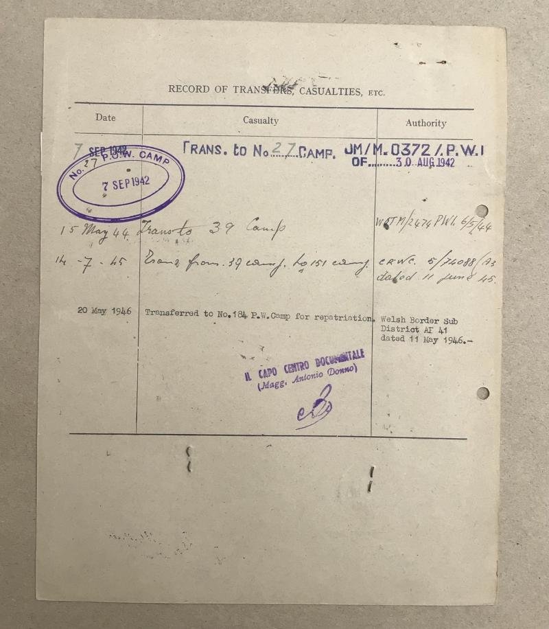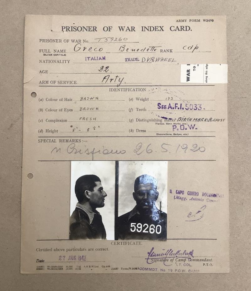 An original British POW file card (approximately A4 size). 'Dated 1942-1946 for a Corporal of the Italian Artillery. Complete with original identity photo attached.
