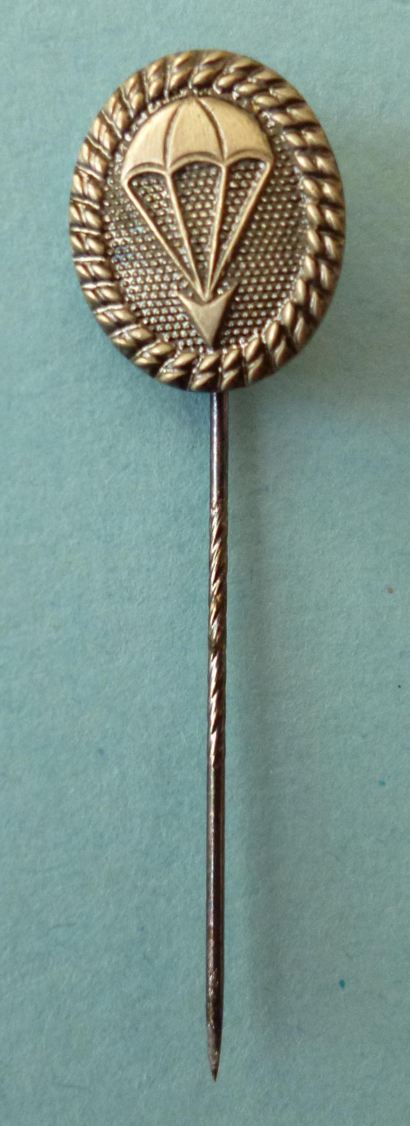 Silver metal oval, with a roped border surrounding a parachute as worn by parachutists /air-landing troops in the period 1955-7 in civilian dress. This was before the formation of the 1st Luftlande Division. The reverse has a knurled stick-pin fixing. No makers mark. Virtually mint condition.