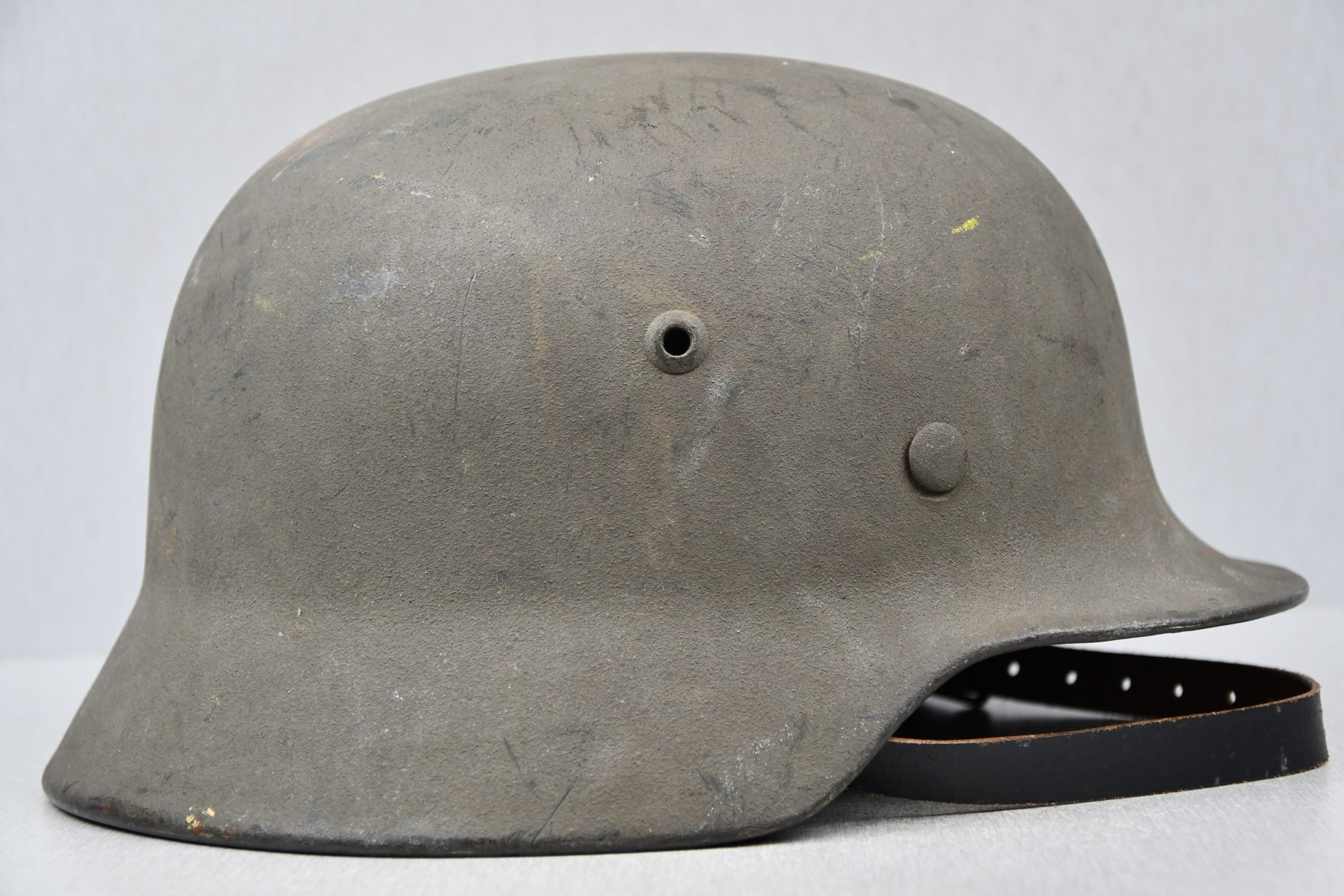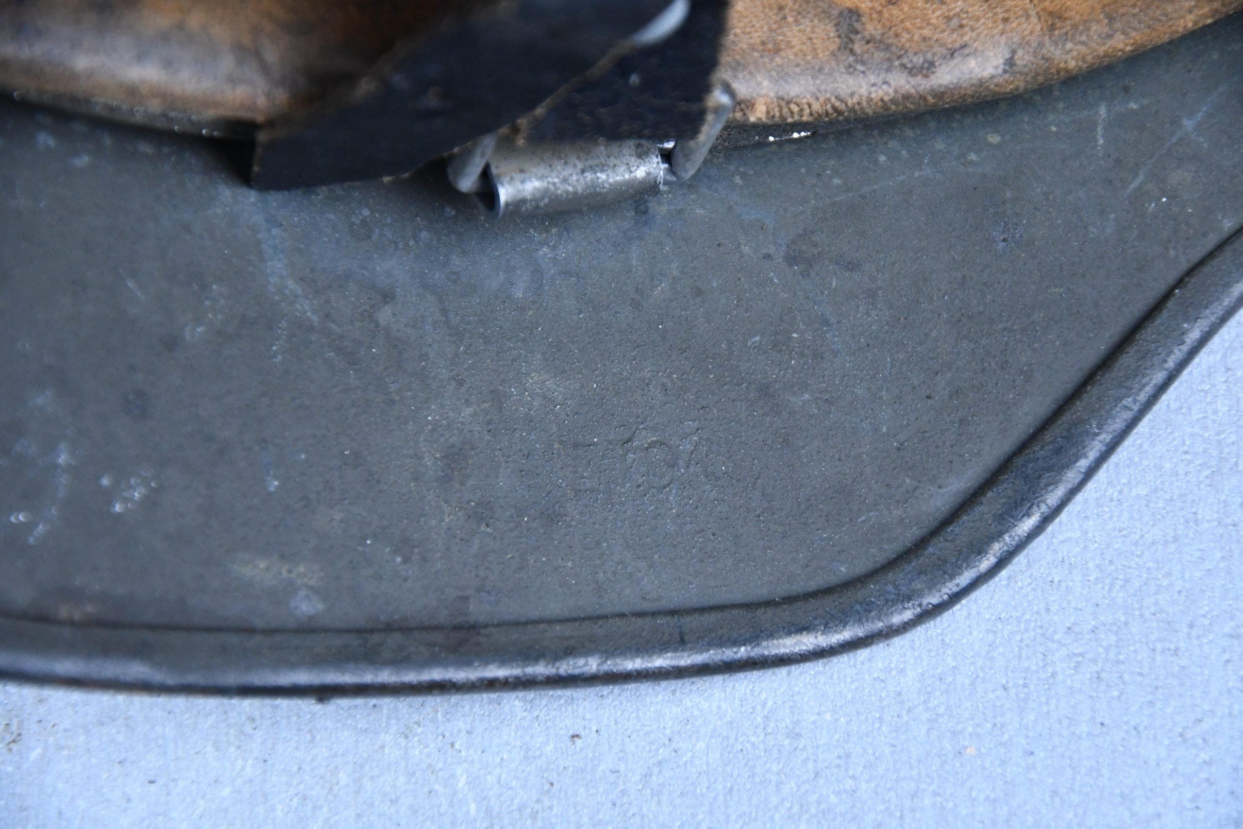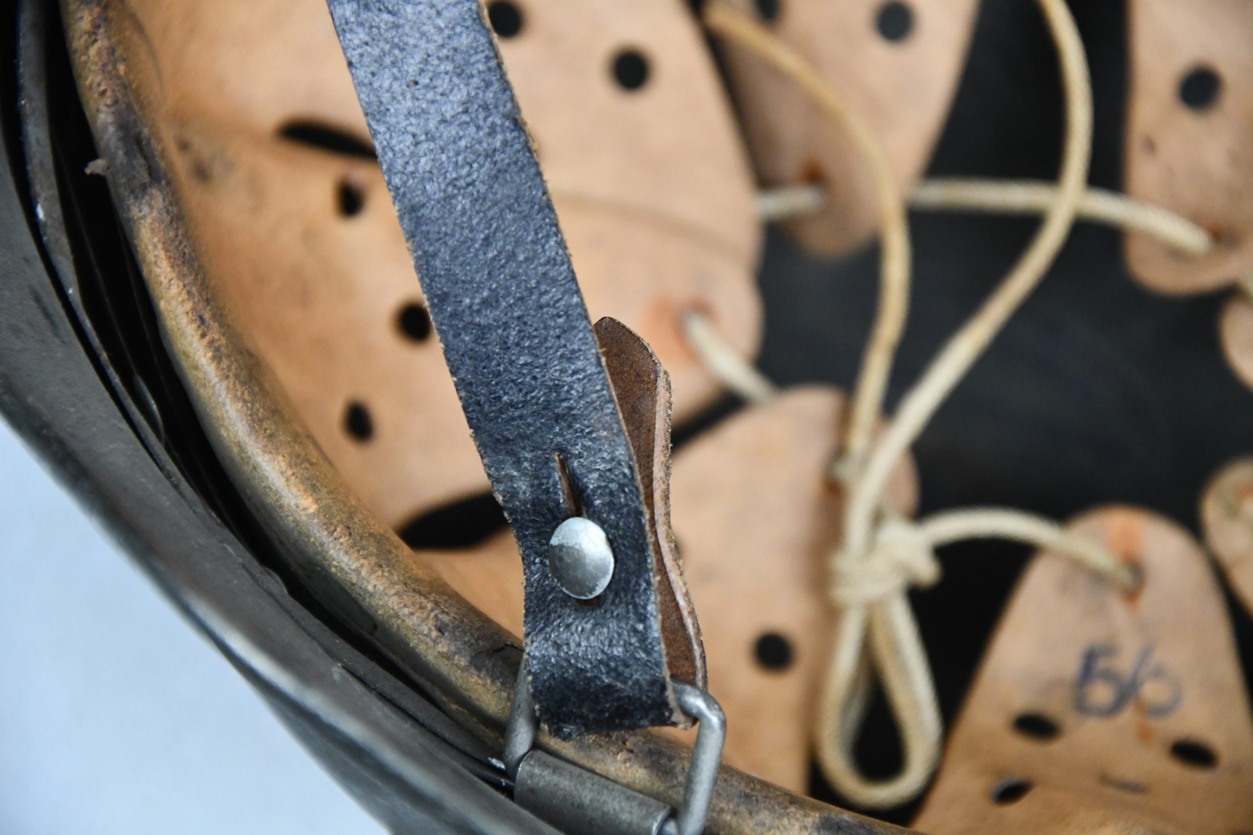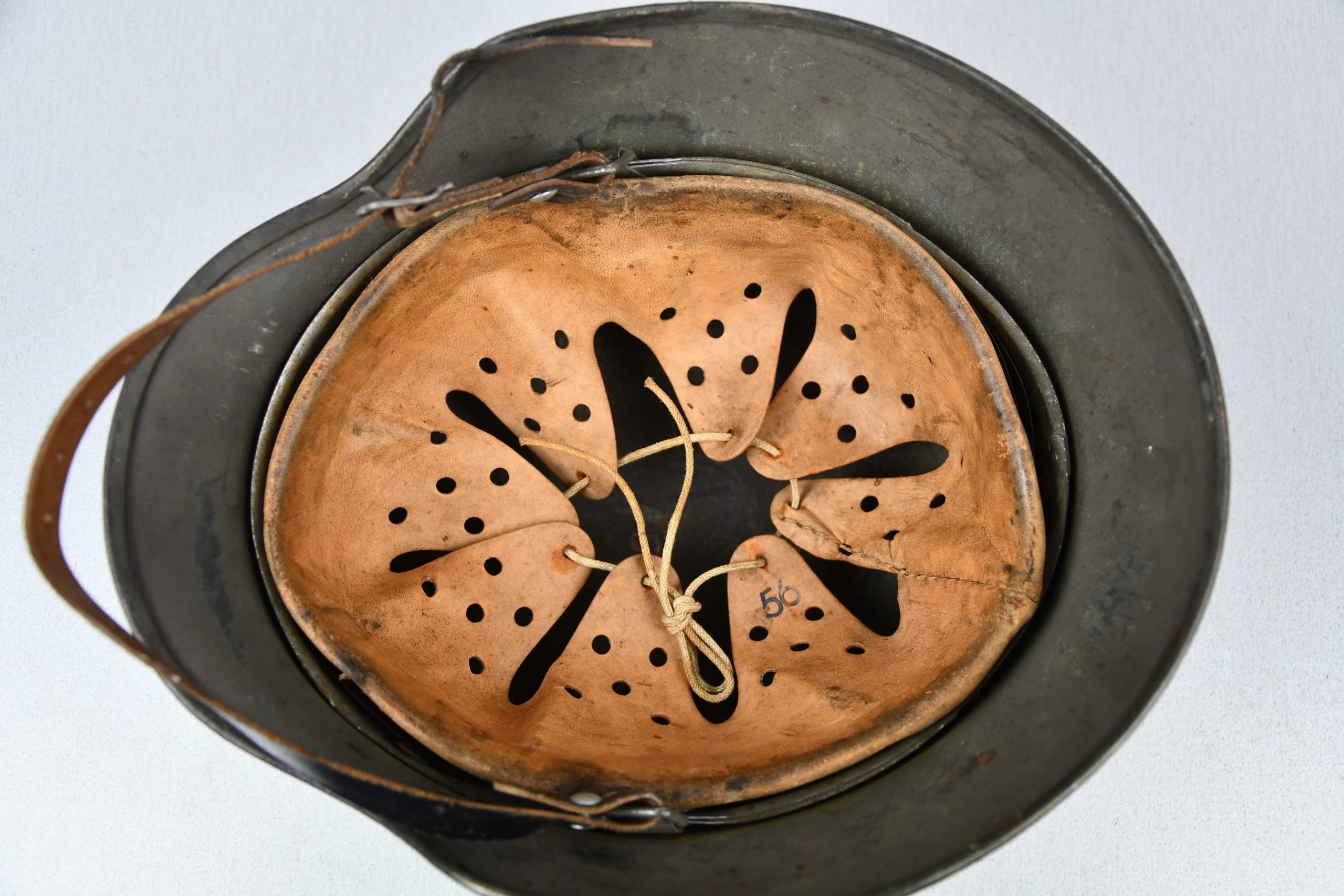 Very attractive M35 army steel helmet, being factory reissued and received a thick grey spray painted exterior, covering the previous layer. Decal once sat on thenew paint was removed due regualtions, but there is also a decal still present under the paint. Original installed liner size 56, with full length draw string. Complete with mid-war chin strap, marked with a RBNr. A very nice reissued helmet, that unlike most reissued pieces having a new spray painted exterior and interior! Dome stamp still visible, as well is the reissue size stamp in the dome '56'. Original reinforced aluminum liner still present, shows spray paint on the liner band, so it never left the helmet during the reissue process โ dated 1940. Shell markings ET64 4801.