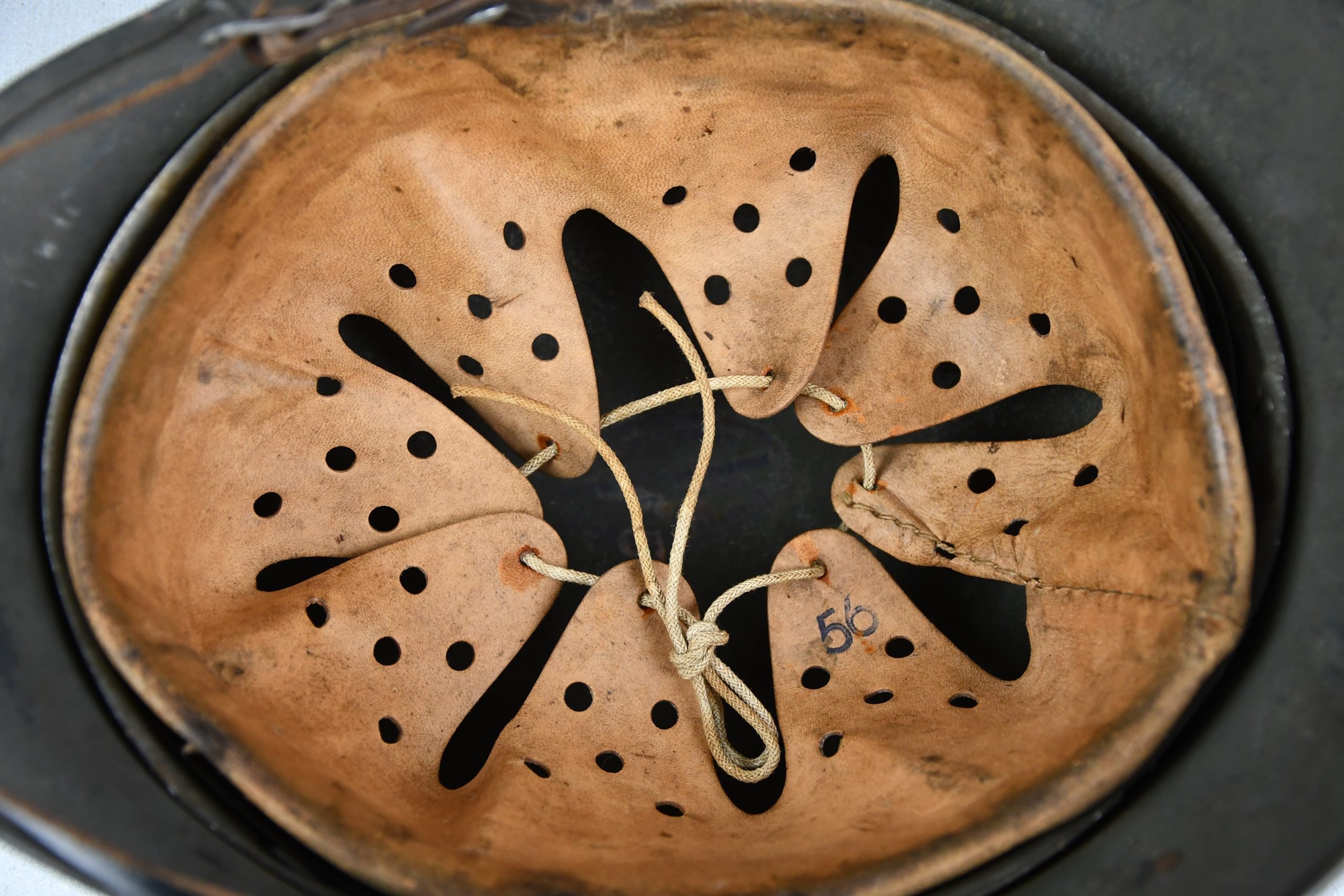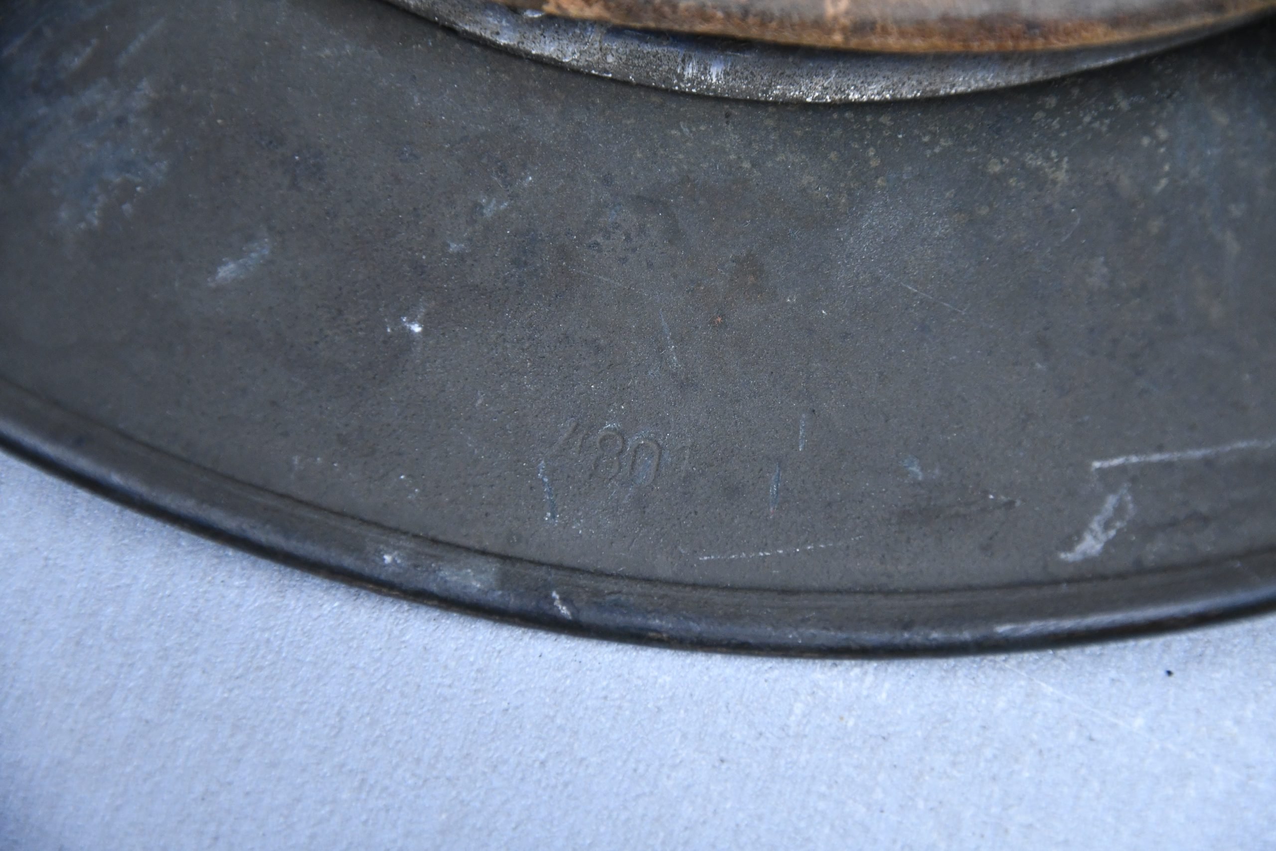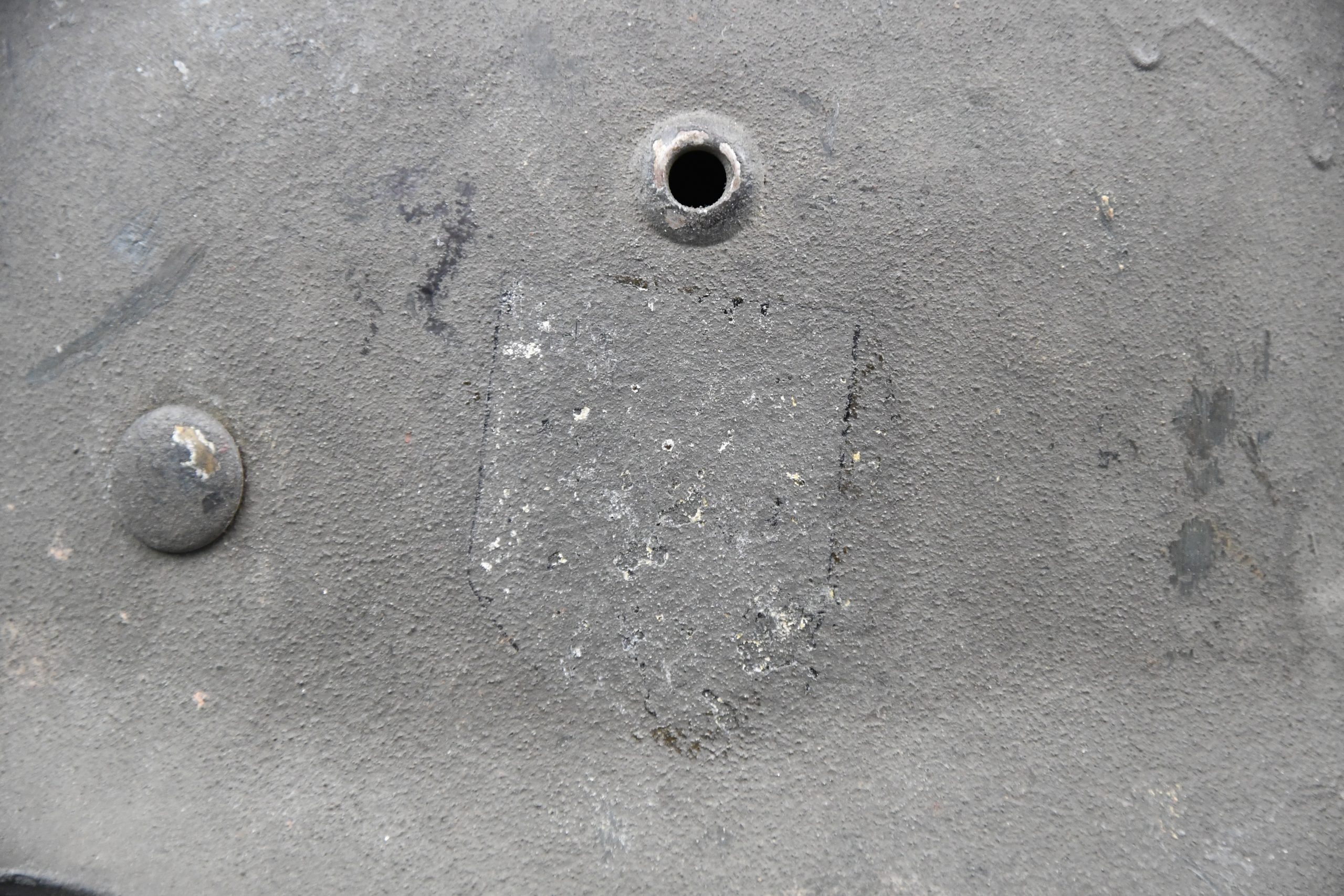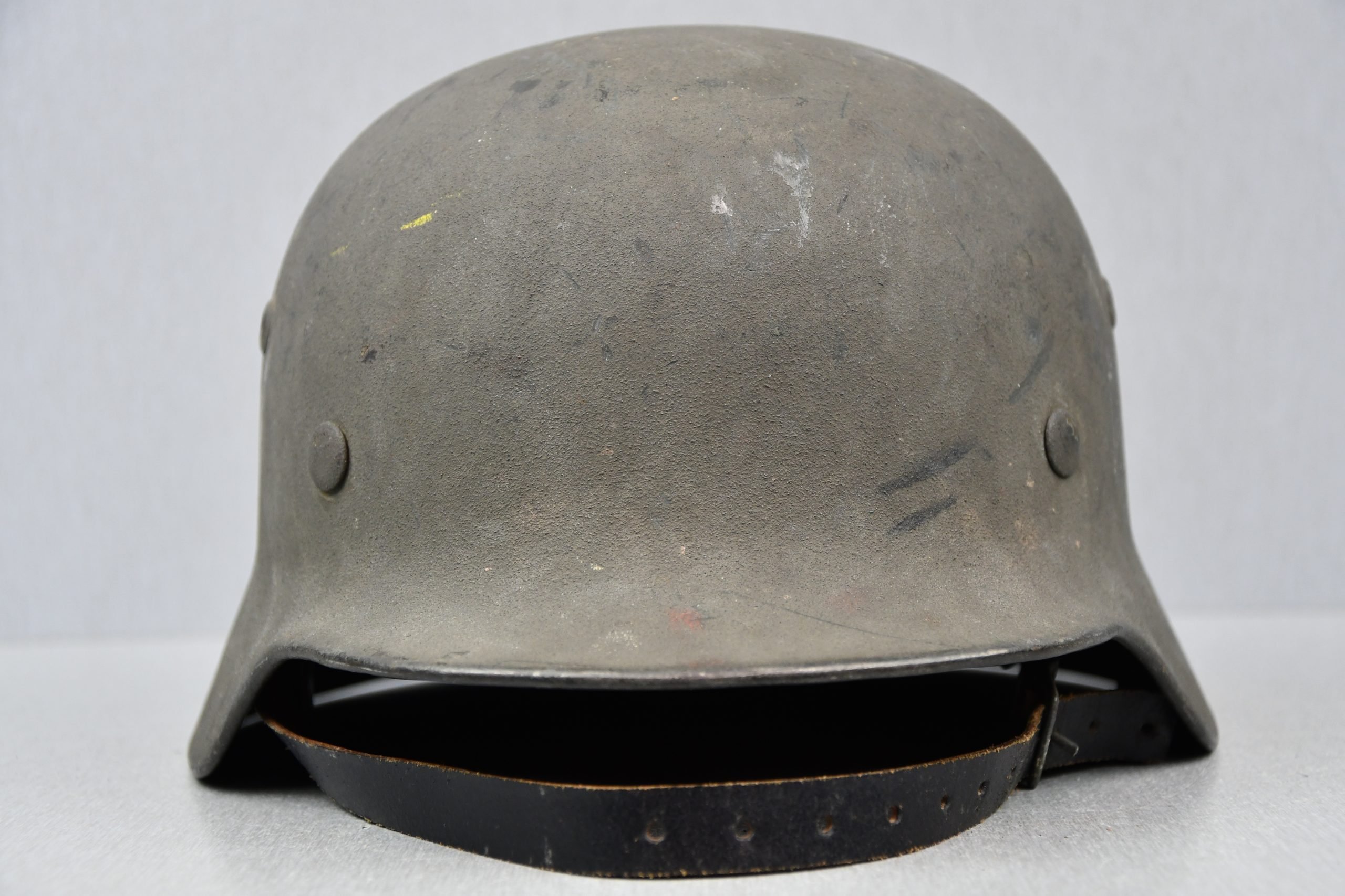 Very attractive M35 army steel helmet, being factory reissued and received a thick grey spray painted exterior, covering the previous layer. Decal once sat on thenew paint was removed due regualtions, but there is also a decal still present under the paint. Original installed liner size 56, with full length draw string. Complete with mid-war chin strap, marked with a RBNr. A very nice reissued helmet, that unlike most reissued pieces having a new spray painted exterior and interior! Dome stamp still visible, as well is the reissue size stamp in the dome '56'. Original reinforced aluminum liner still present, shows spray paint on the liner band, so it never left the helmet during the reissue process โ dated 1940. Shell markings ET64 4801.