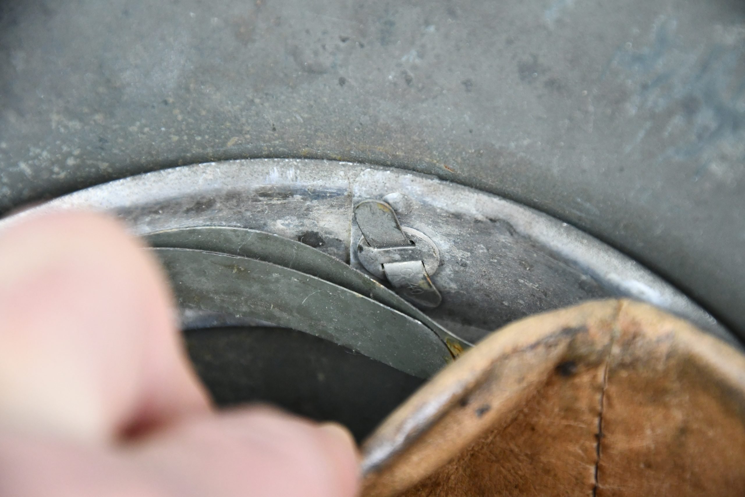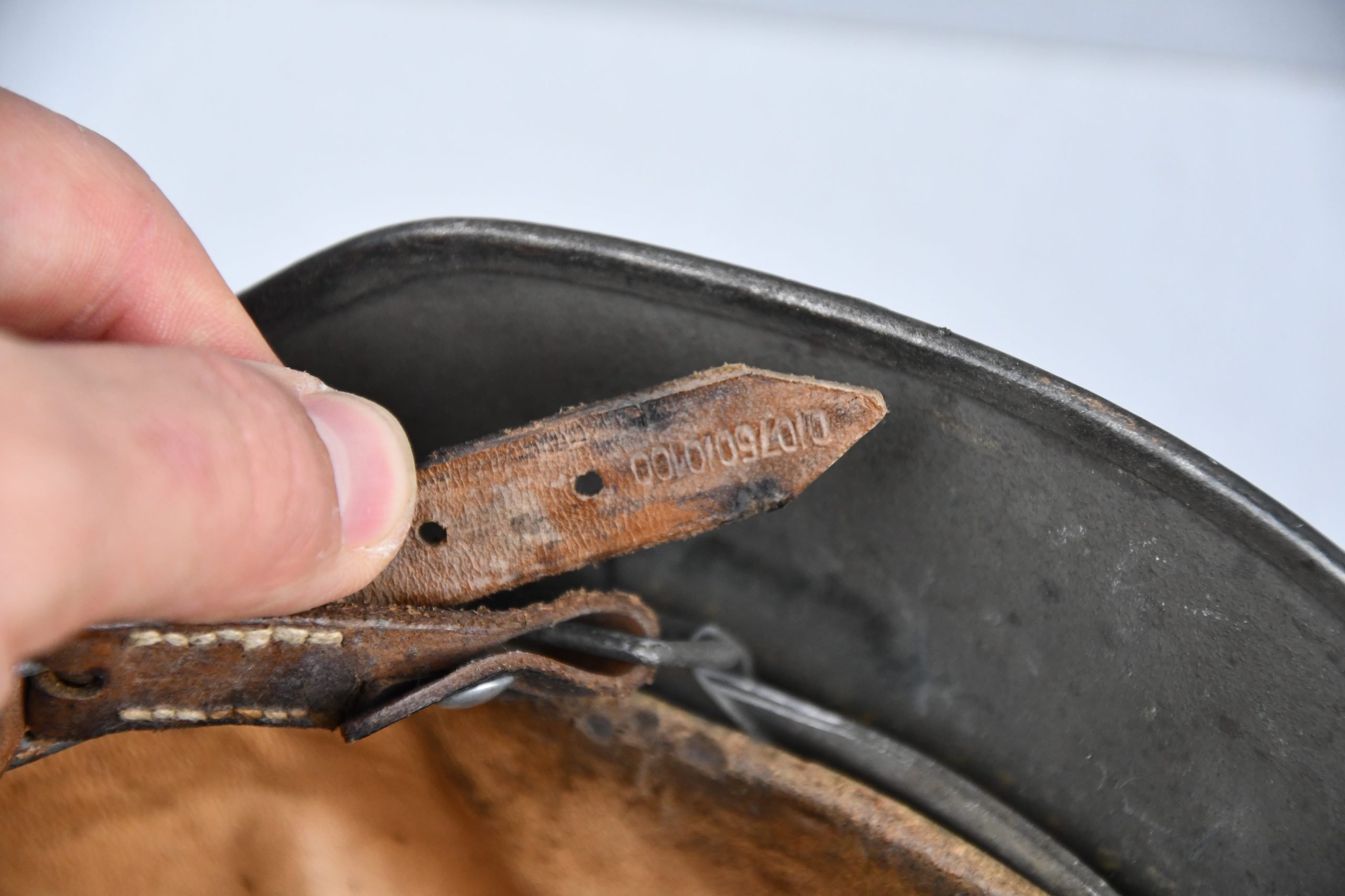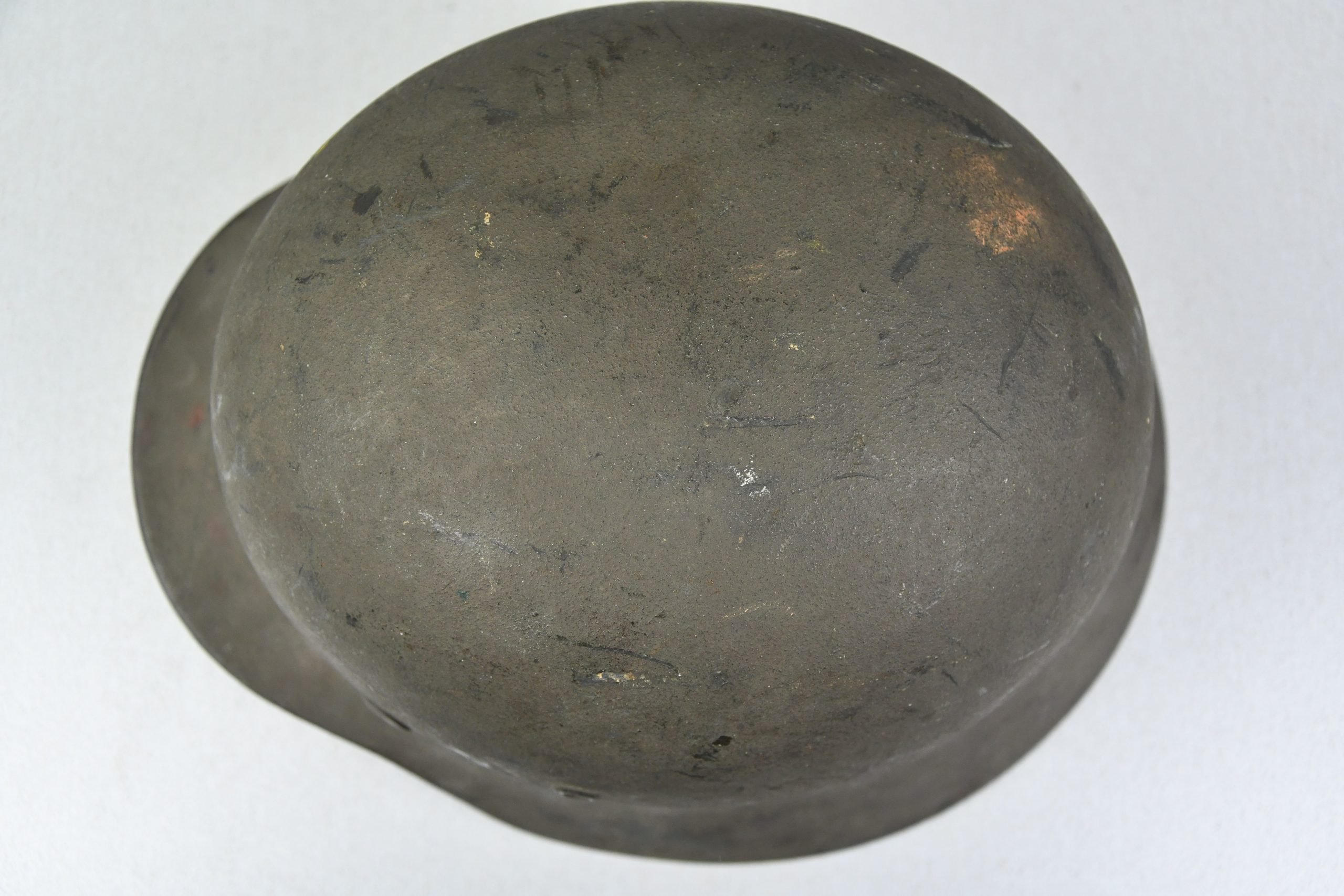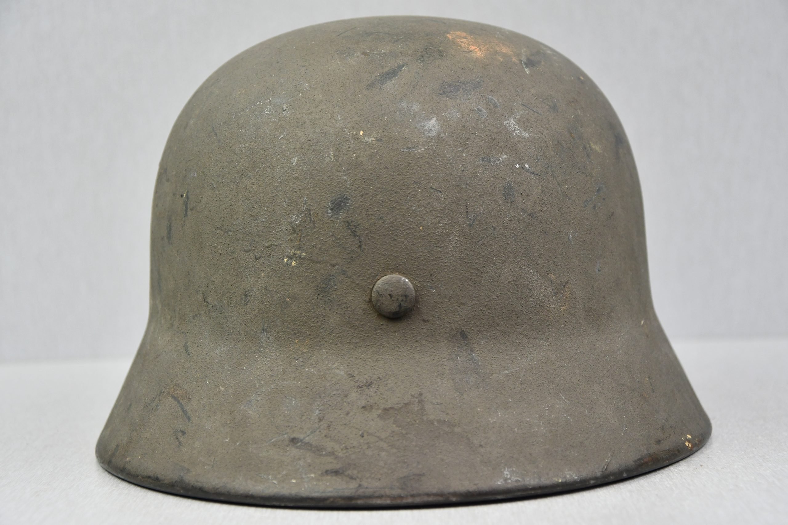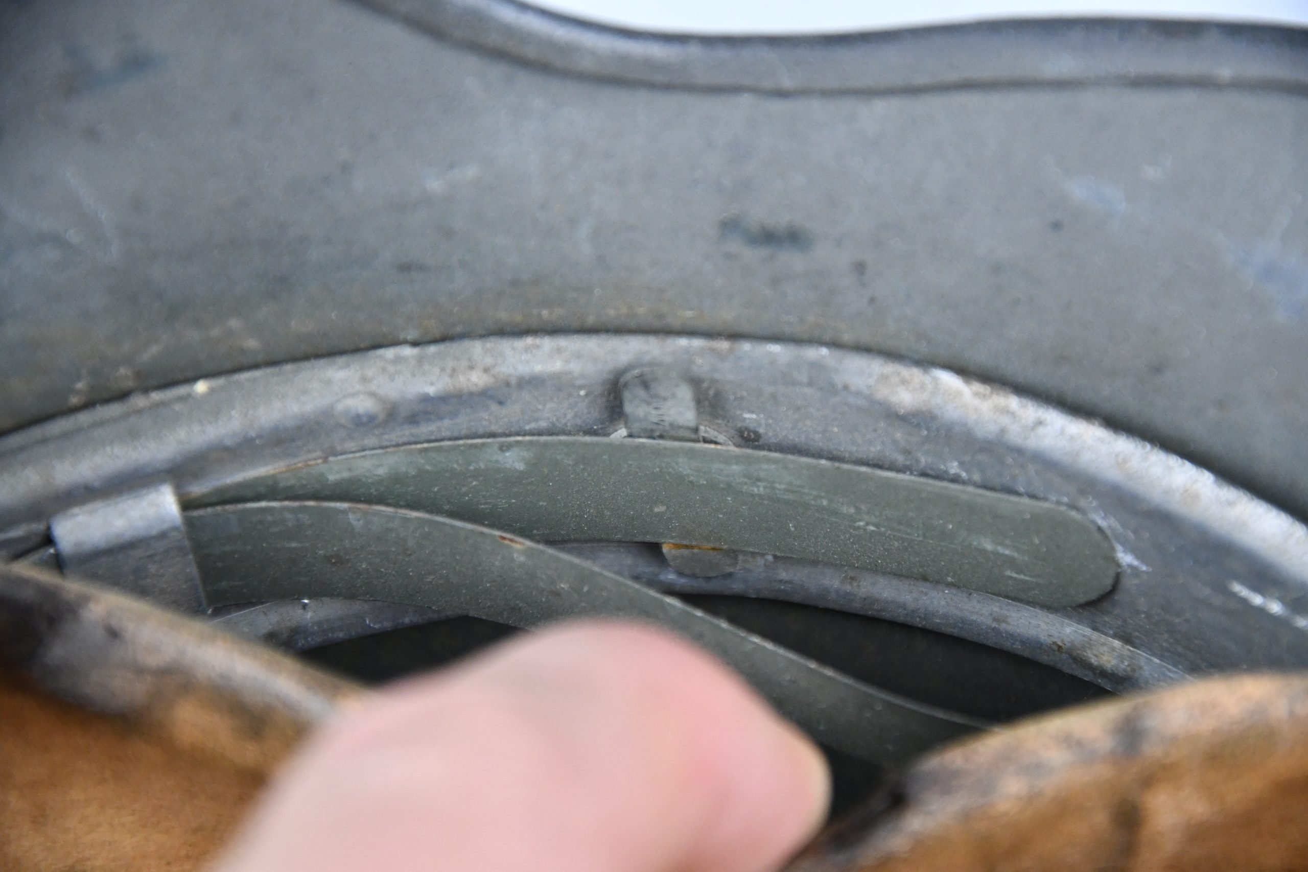 Very attractive M35 army steel helmet, being factory reissued and received a thick grey spray painted exterior, covering the previous layer. Decal once sat on thenew paint was removed due regualtions, but there is also a decal still present under the paint. Original installed liner size 56, with full length draw string. Complete with mid-war chin strap, marked with a RBNr. A very nice reissued helmet, that unlike most reissued pieces having a new spray painted exterior and interior! Dome stamp still visible, as well is the reissue size stamp in the dome '56'. Original reinforced aluminum liner still present, shows spray paint on the liner band, so it never left the helmet during the reissue process โ dated 1940. Shell markings ET64 4801.