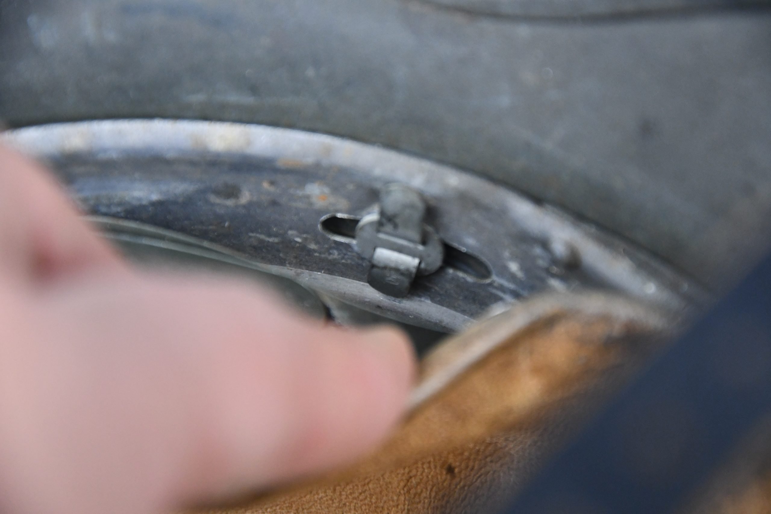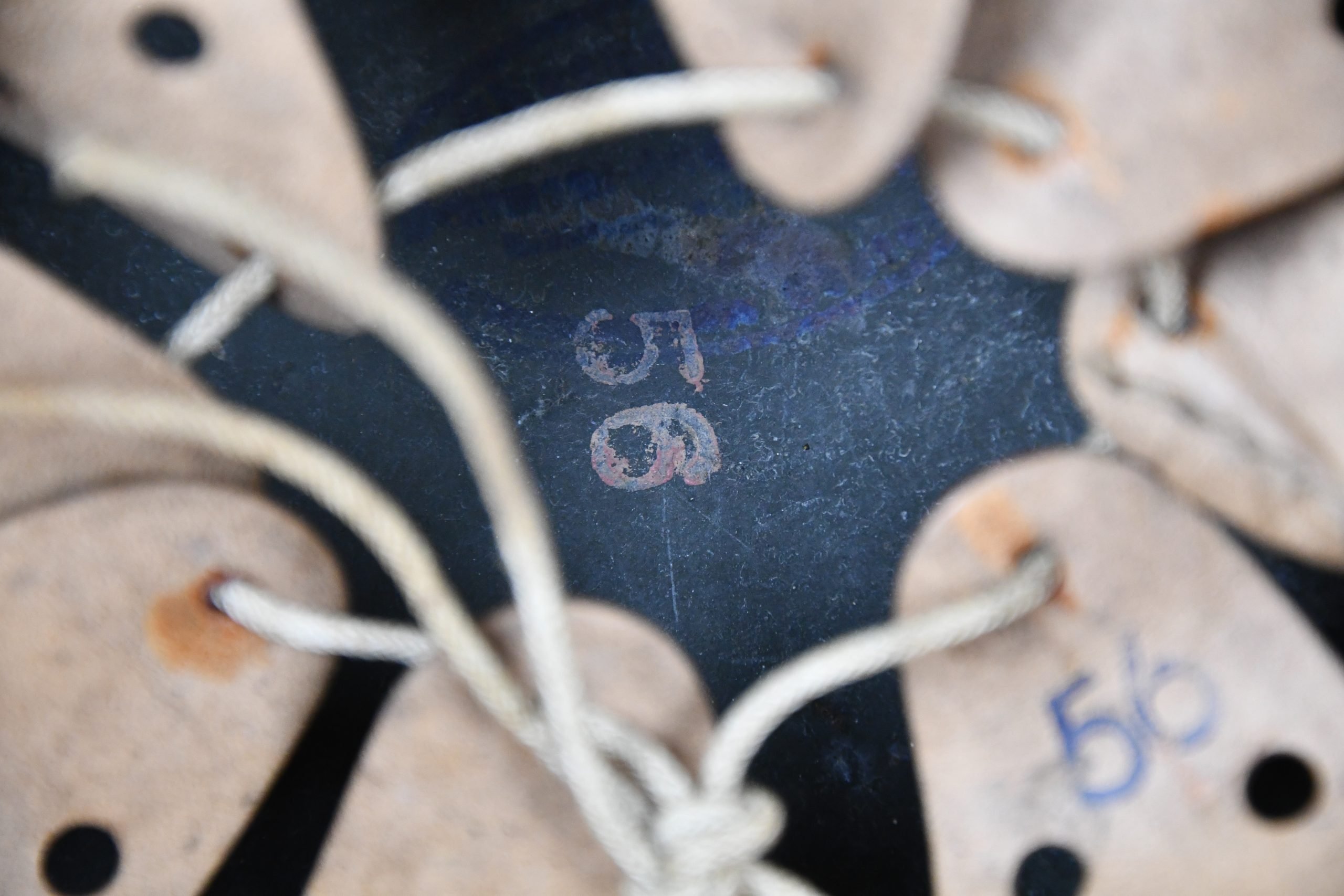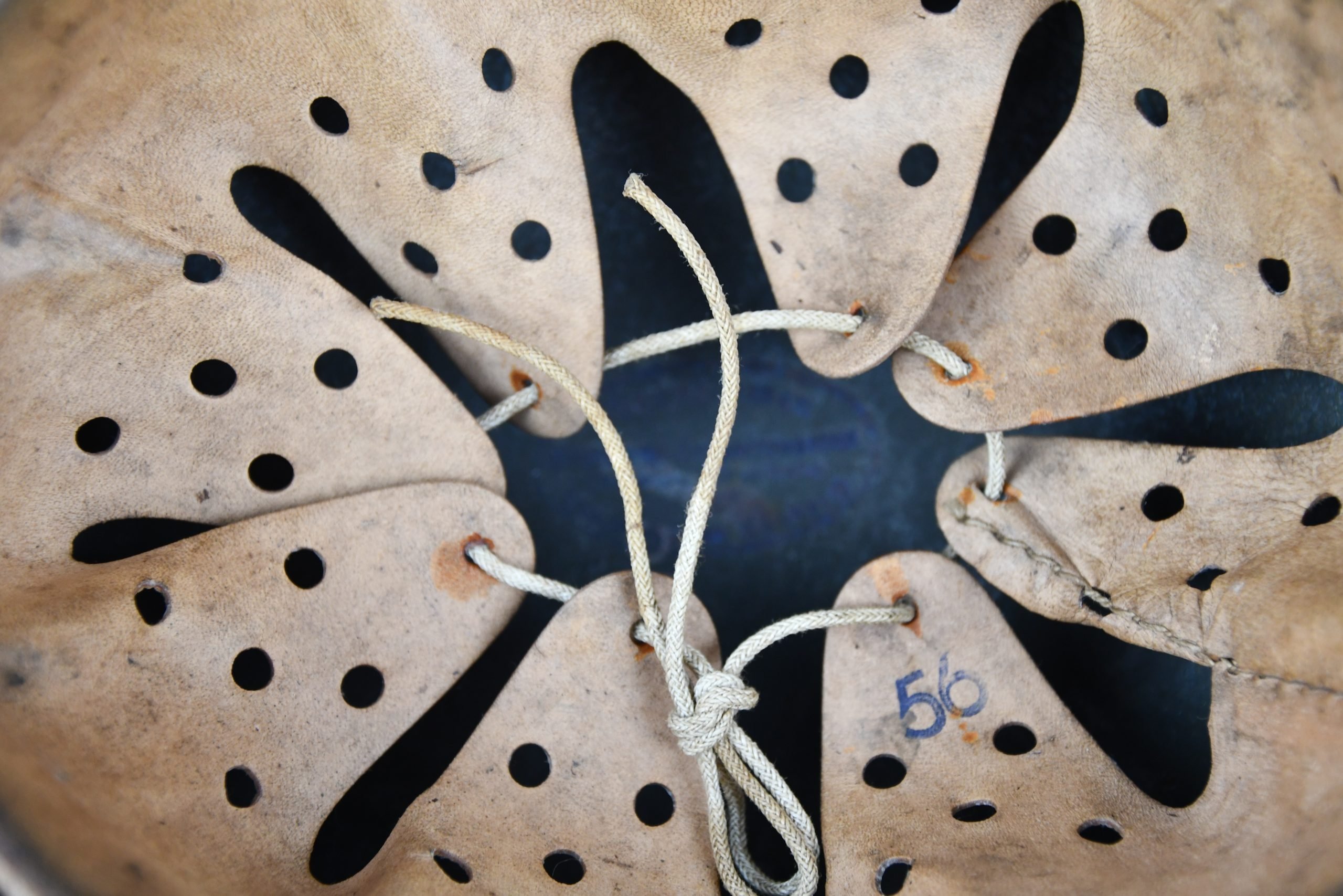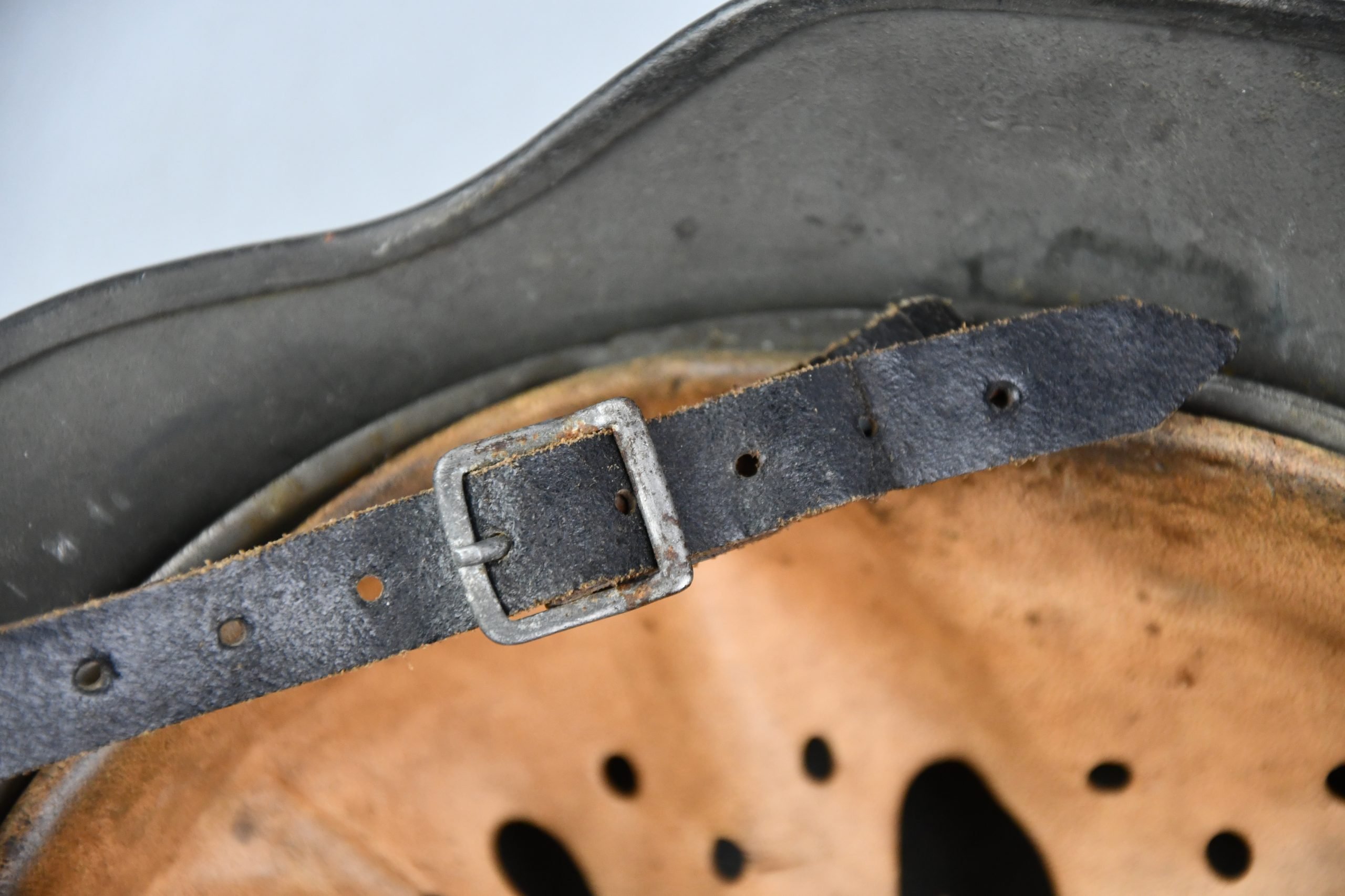 Very attractive M35 army steel helmet, being factory reissued and received a thick grey spray painted exterior, covering the previous layer. Decal once sat on thenew paint was removed due regualtions, but there is also a decal still present under the paint. Original installed liner size 56, with full length draw string. Complete with mid-war chin strap, marked with a RBNr. A very nice reissued helmet, that unlike most reissued pieces having a new spray painted exterior and interior! Dome stamp still visible, as well is the reissue size stamp in the dome '56'. Original reinforced aluminum liner still present, shows spray paint on the liner band, so it never left the helmet during the reissue process โ dated 1940. Shell markings ET64 4801.