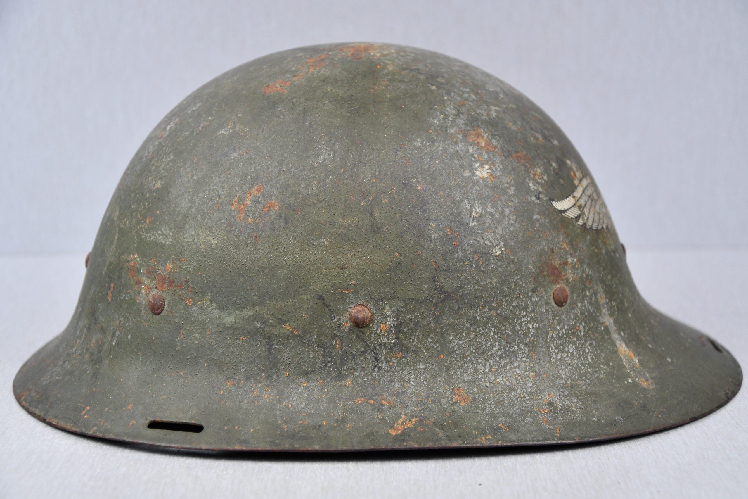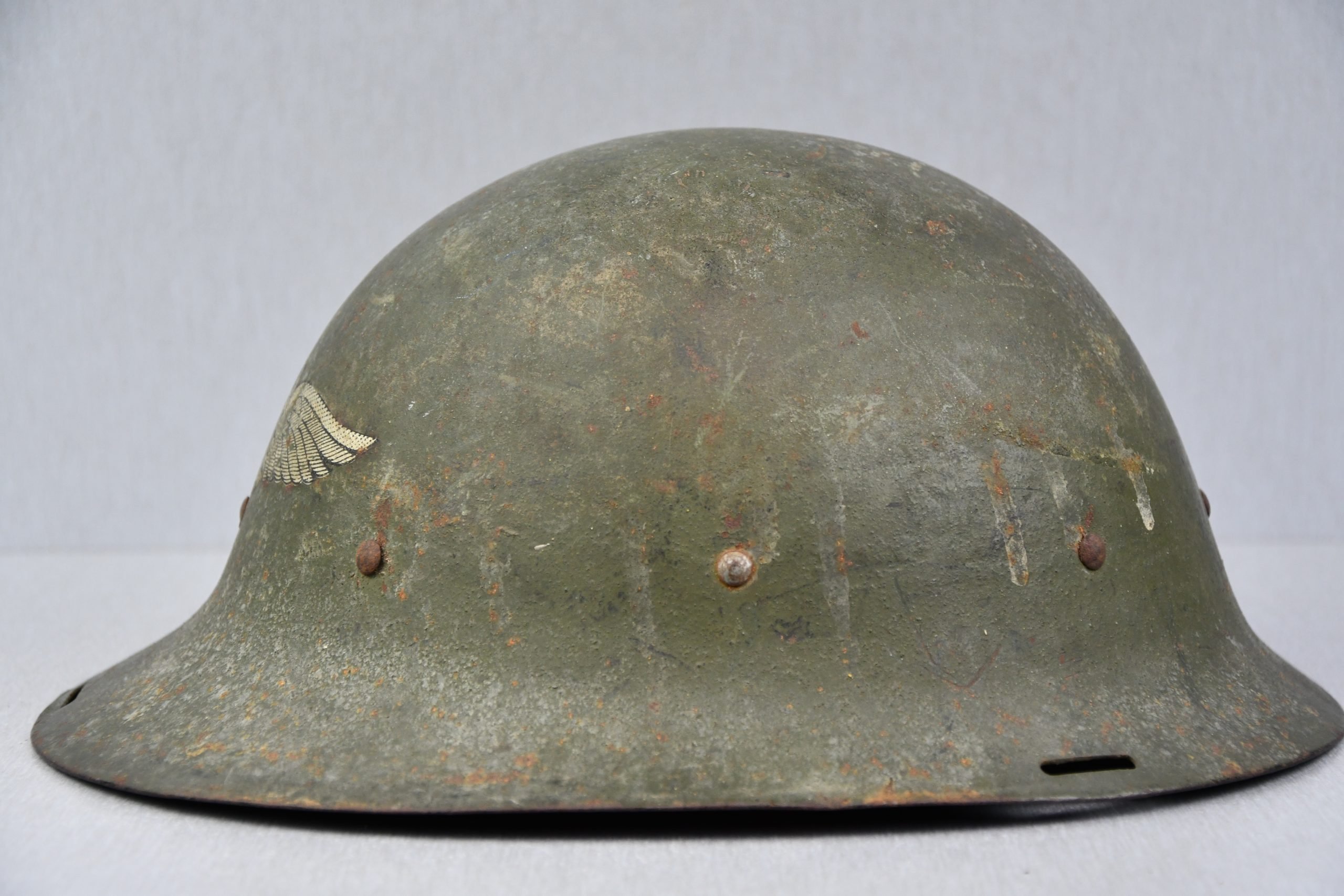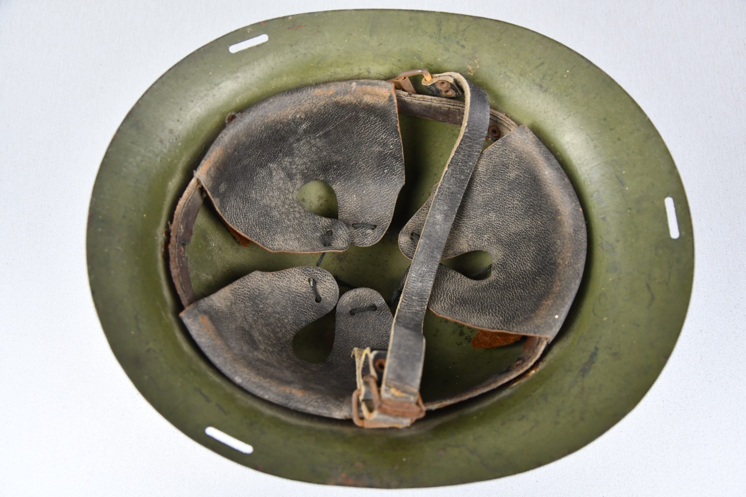 A very unusual and rarely seen variation of a captured Dutch M16b model steel helmet, that has been reissued for the German Luftschutz (air raid protection) by simply adding a decal on the front of the helmet. The decal shows wear but is still firmly present. Helmet is complete with original installed liner and chin strap.
