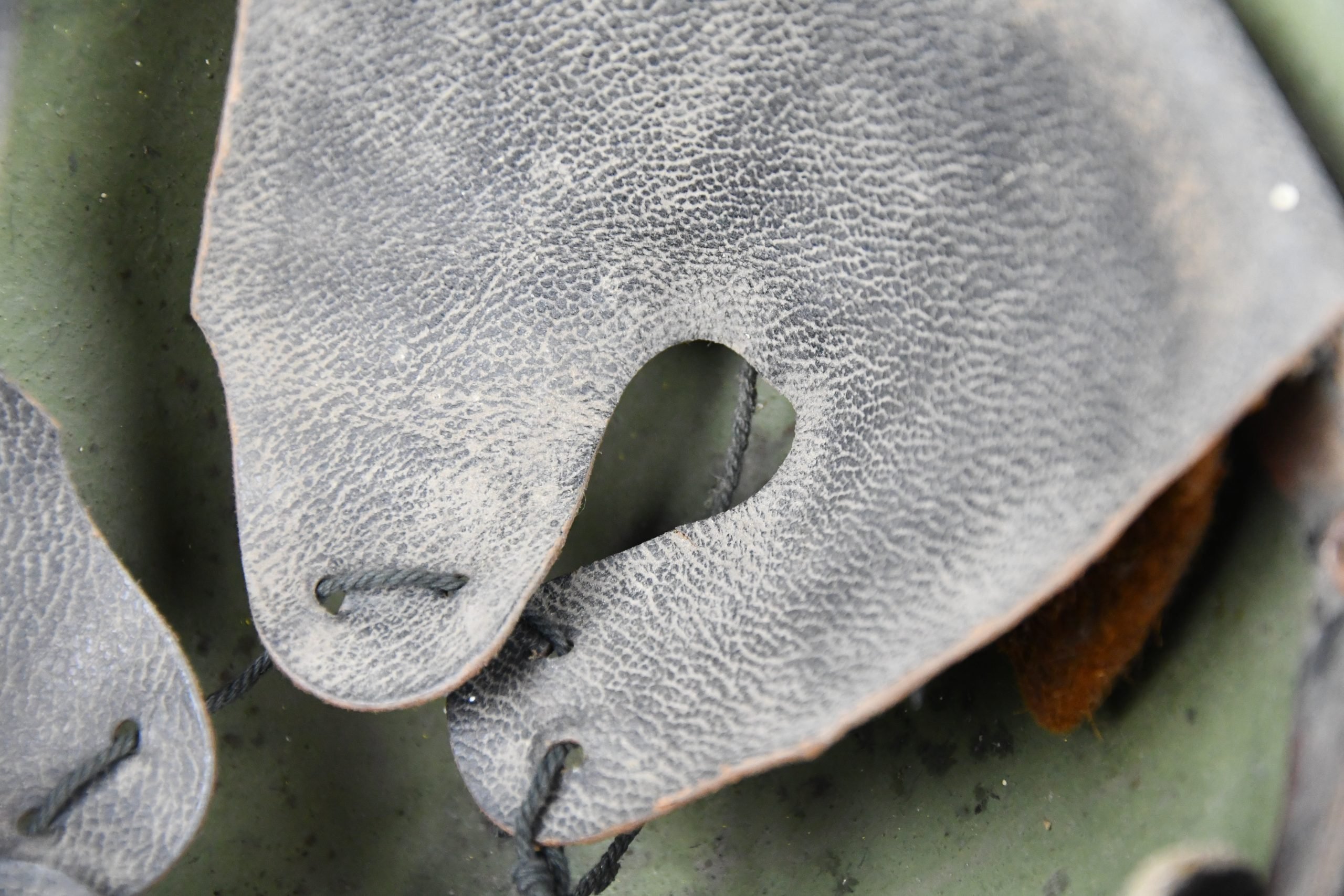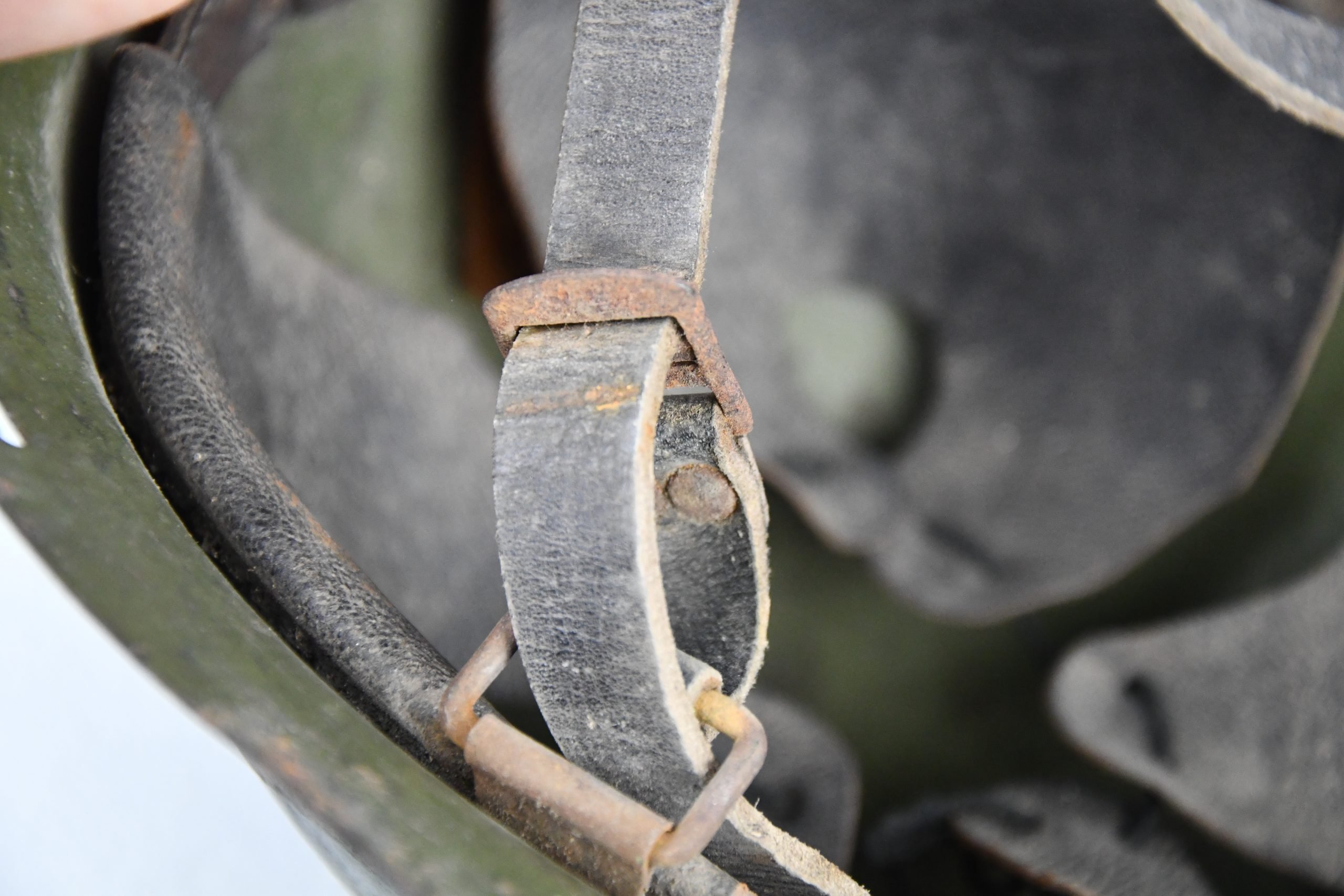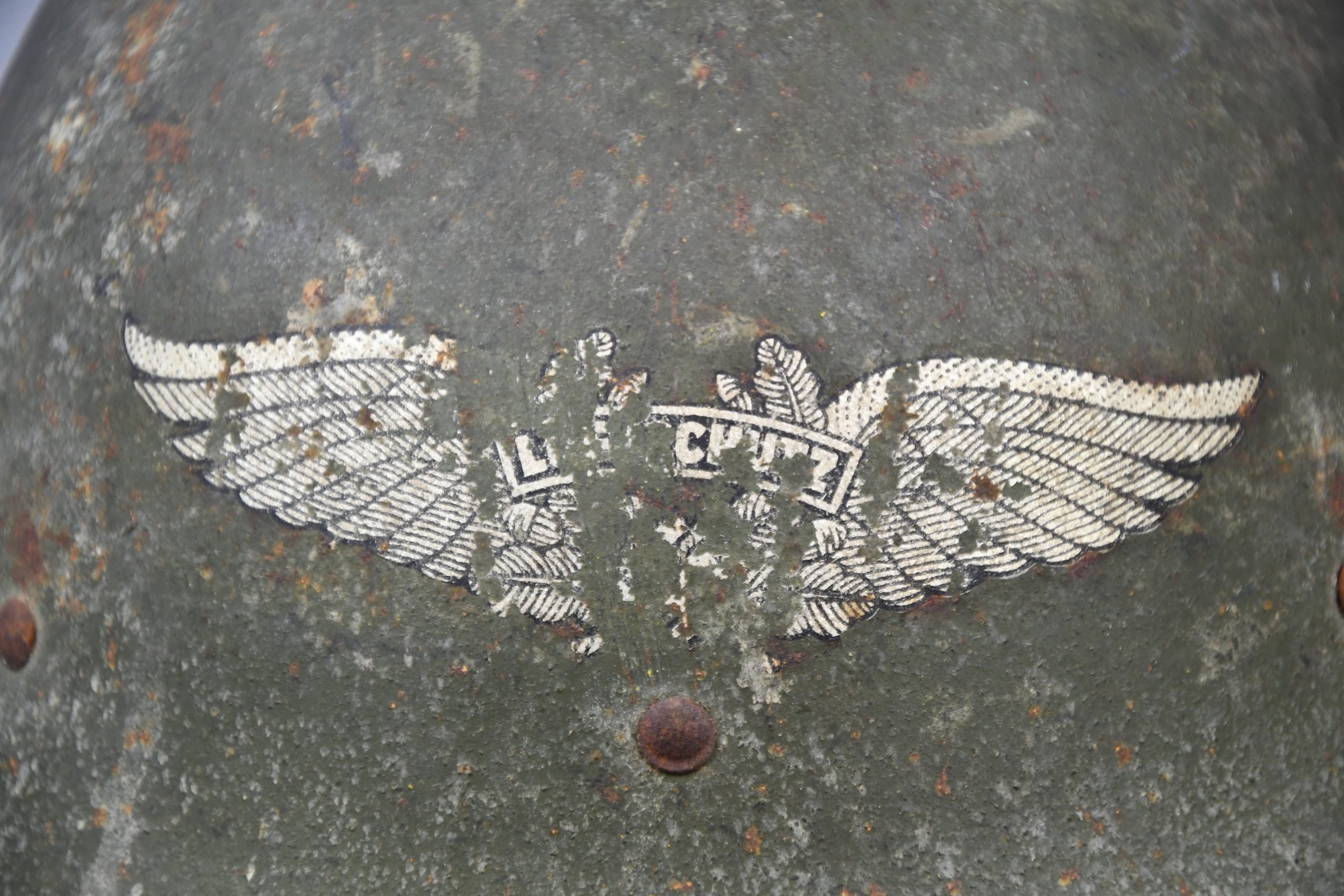 A very unusual and rarely seen variation of a captured Dutch M16b model steel helmet, that has been reissued for the German Luftschutz (air raid protection) by simply adding a decal on the front of the helmet. The decal shows wear but is still firmly present. Helmet is complete with original installed liner and chin strap.