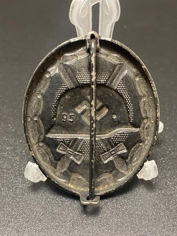 Original Black wound badge maker marked 95 for Adolf Scholze. In good condition, a rare maker marked on this badge.