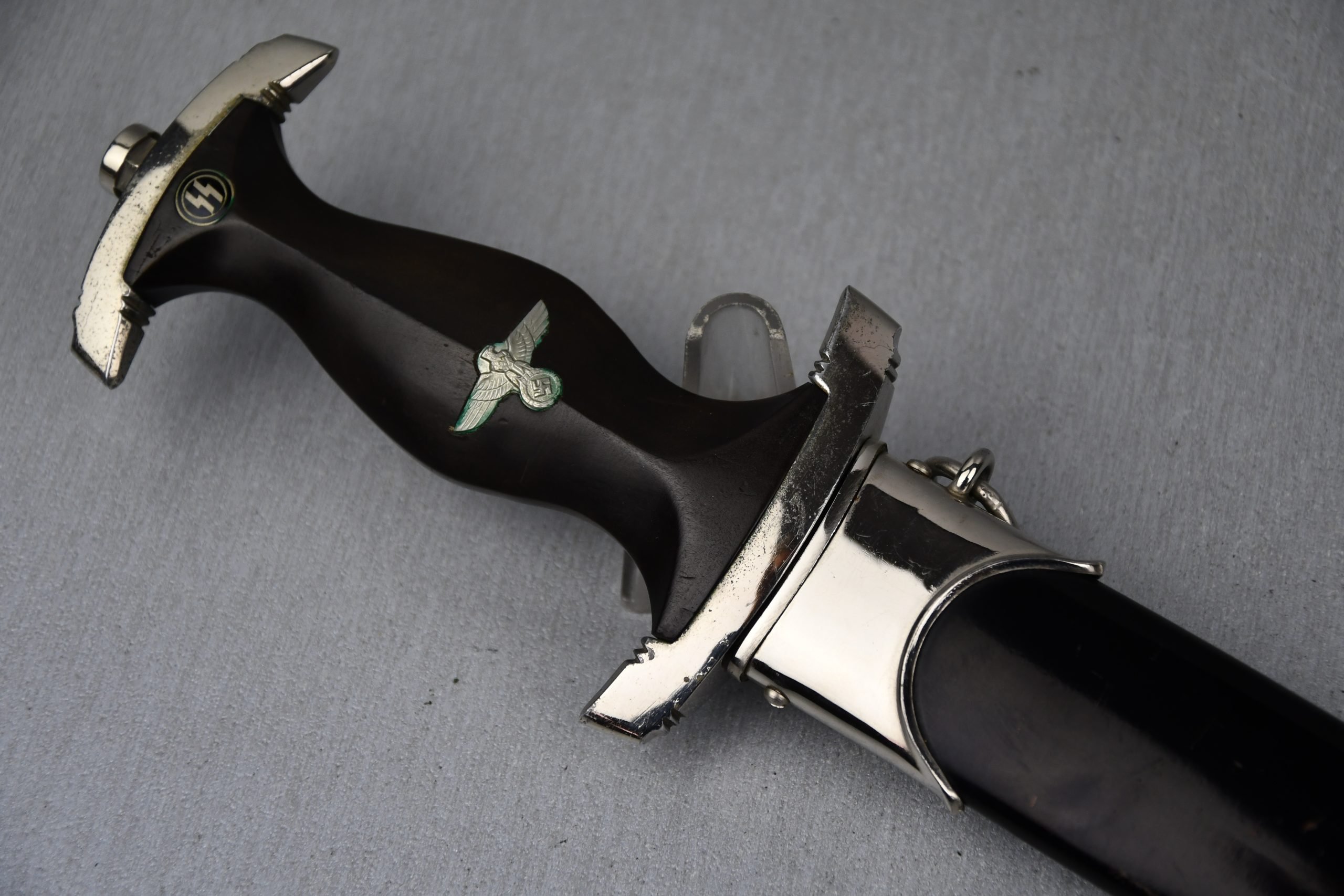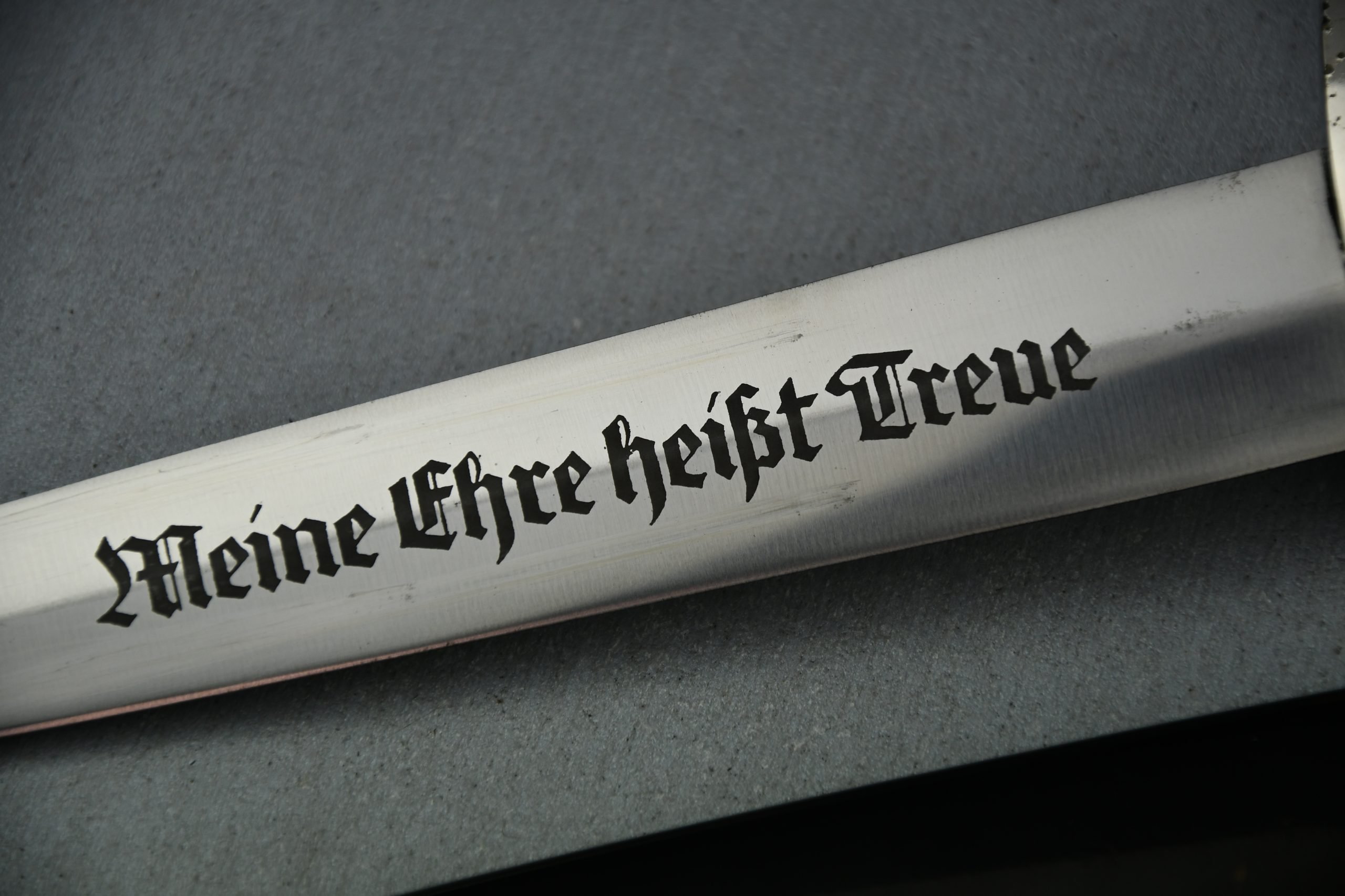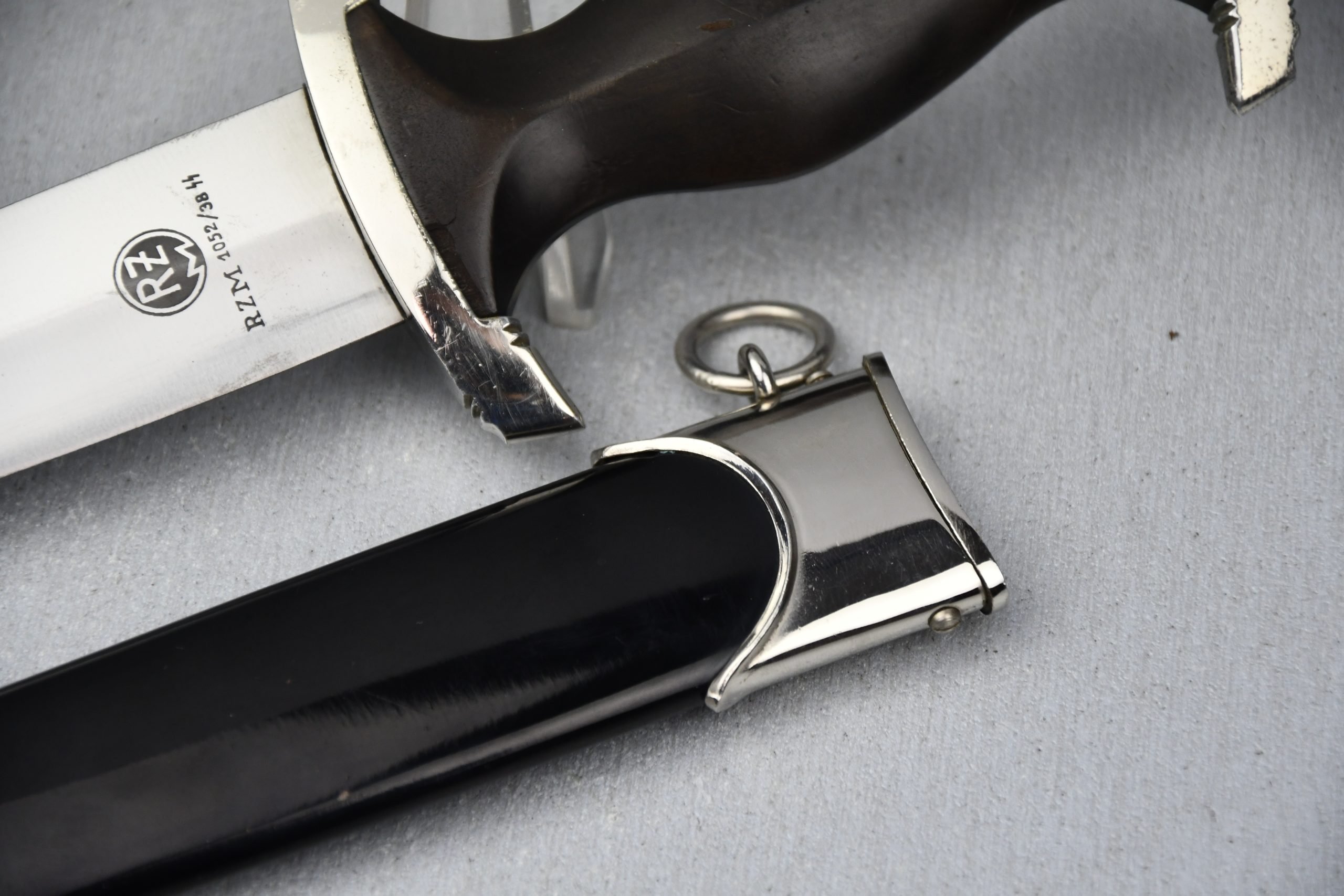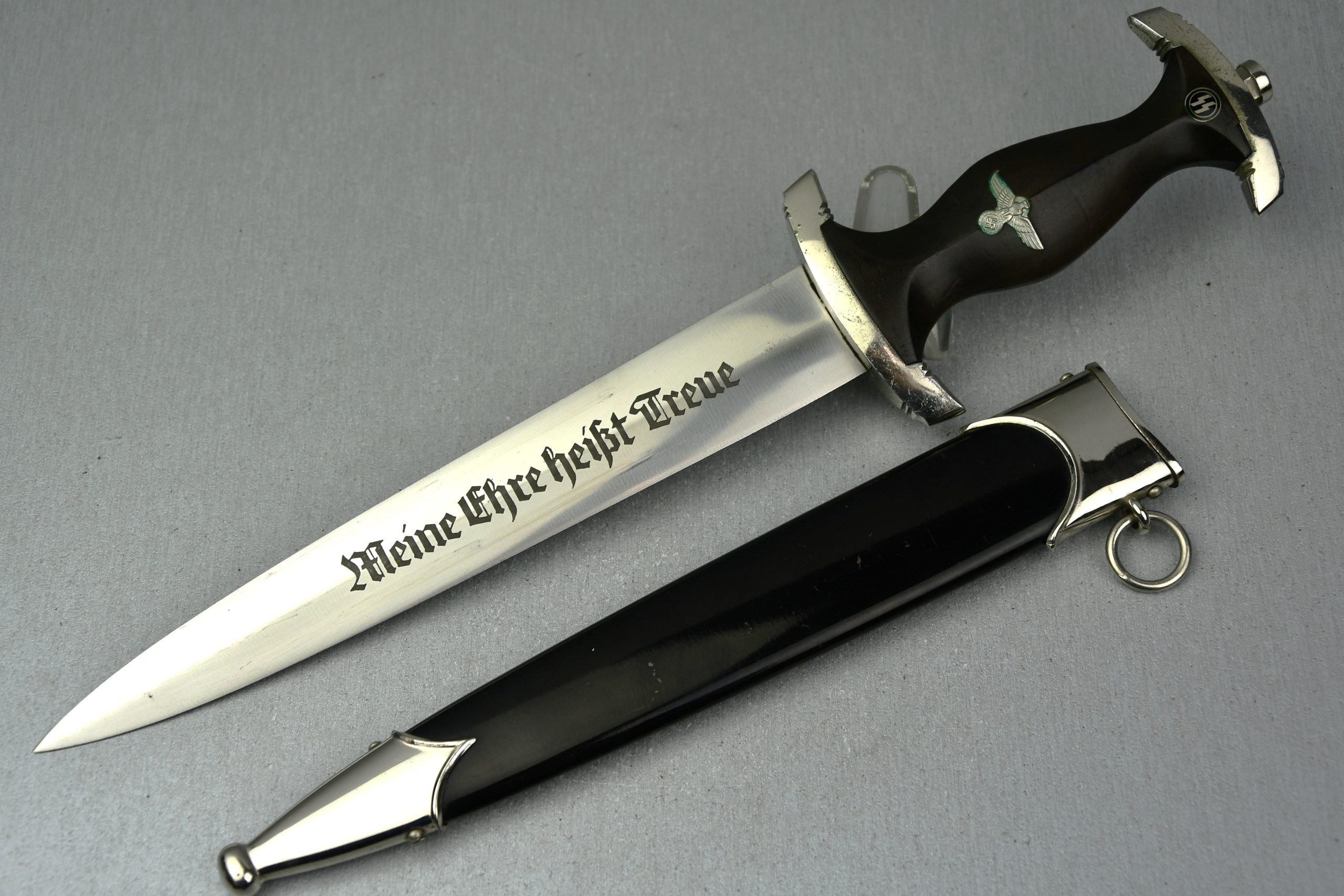 Stunning unworn โ MINT โ M33 pattern SS dagger in pristine condition. Blade is perfect, shows nice cross graining and only light runner marks. Maker marked by RZM 1052/38 SS, which is attributed to Pumawerk, Solingen, a rarely encountered manufacturer! Eagle on the grip shows nice patina and green patina. This is by far the best SS dagger I had in while that is so perfect and unissued โ impossible to upgrade this example.SHIPPING ONLY IN MAINLAND EUROPE โ COULD BRING THIS TO USA WHEN I FLY OVER