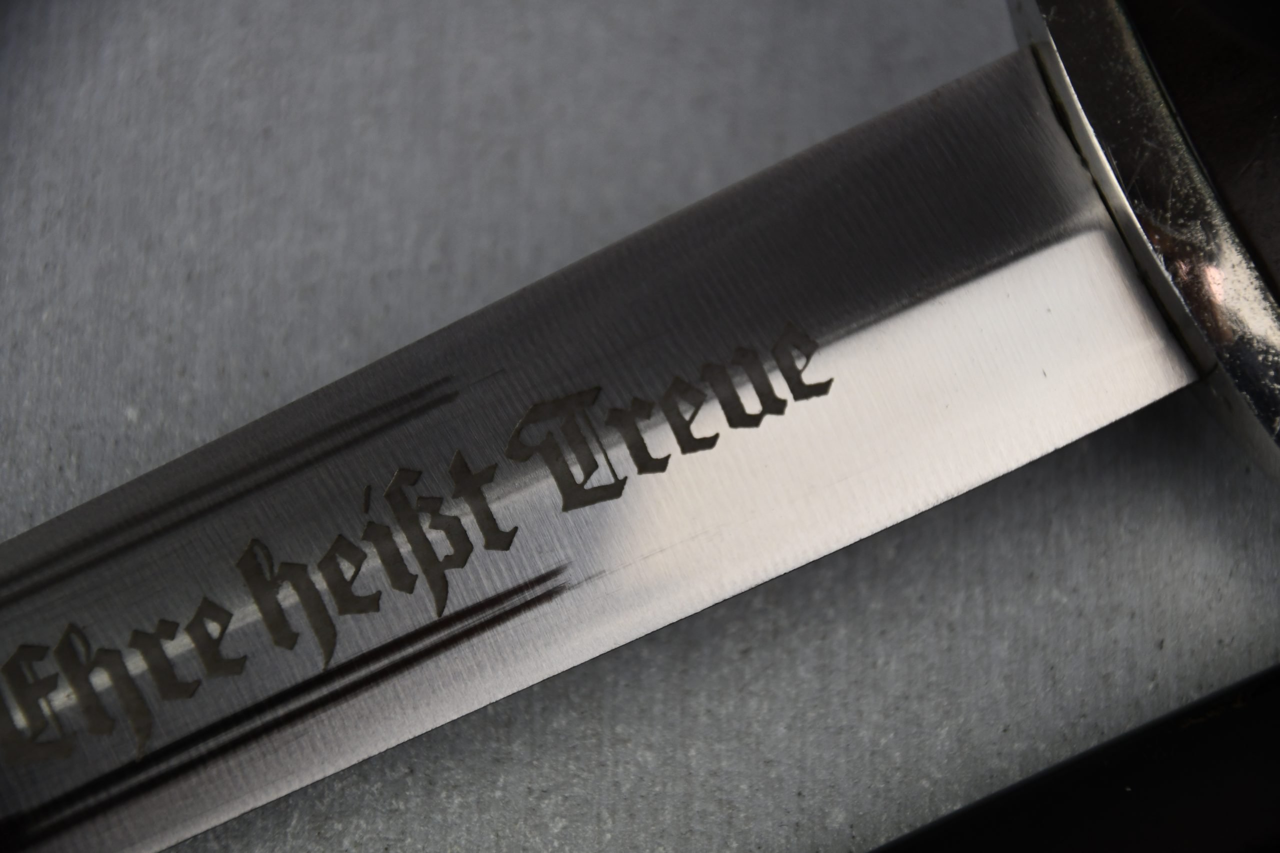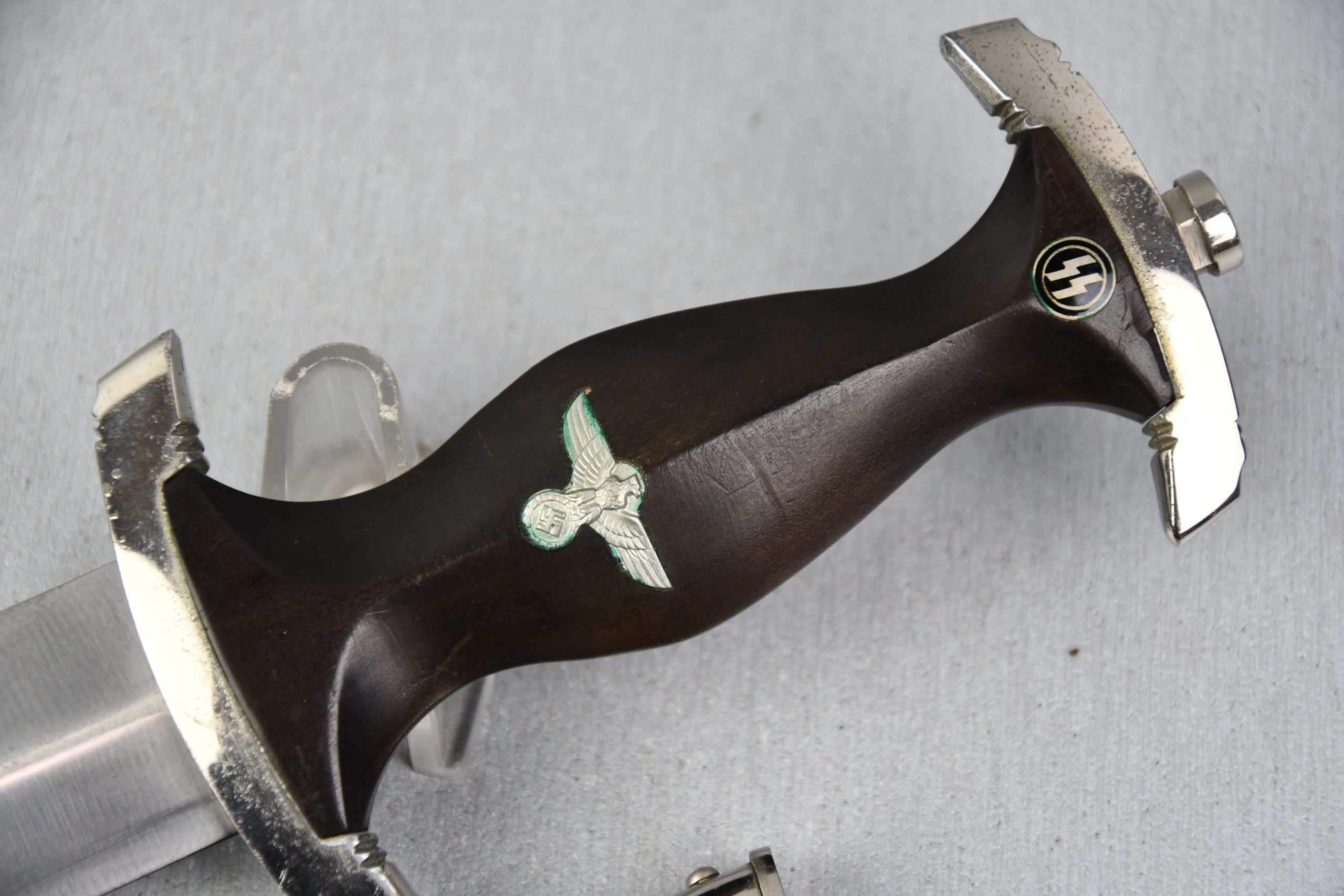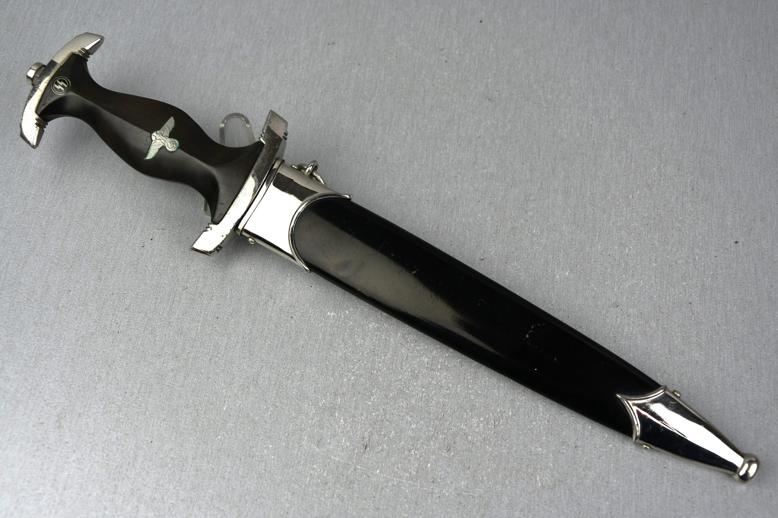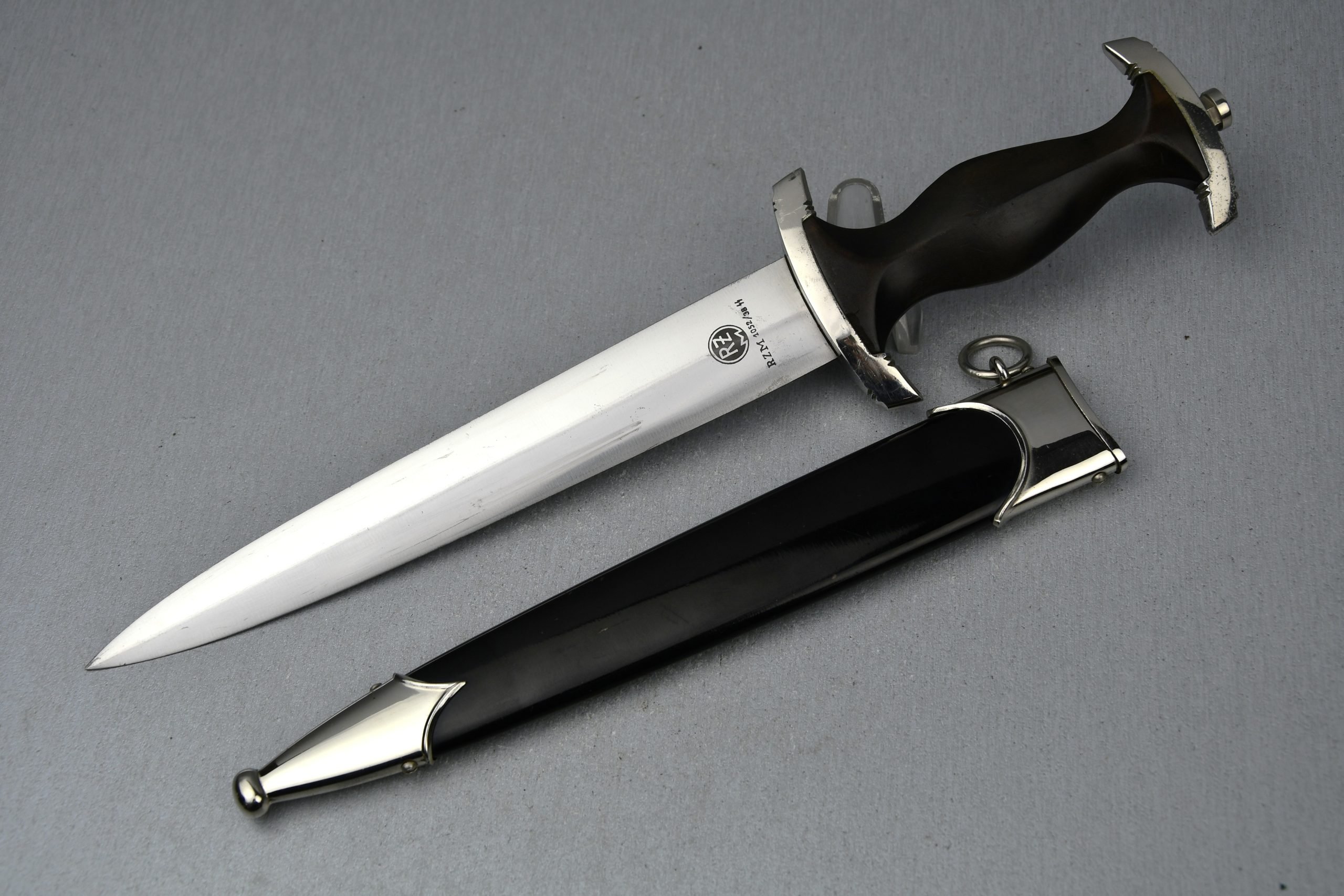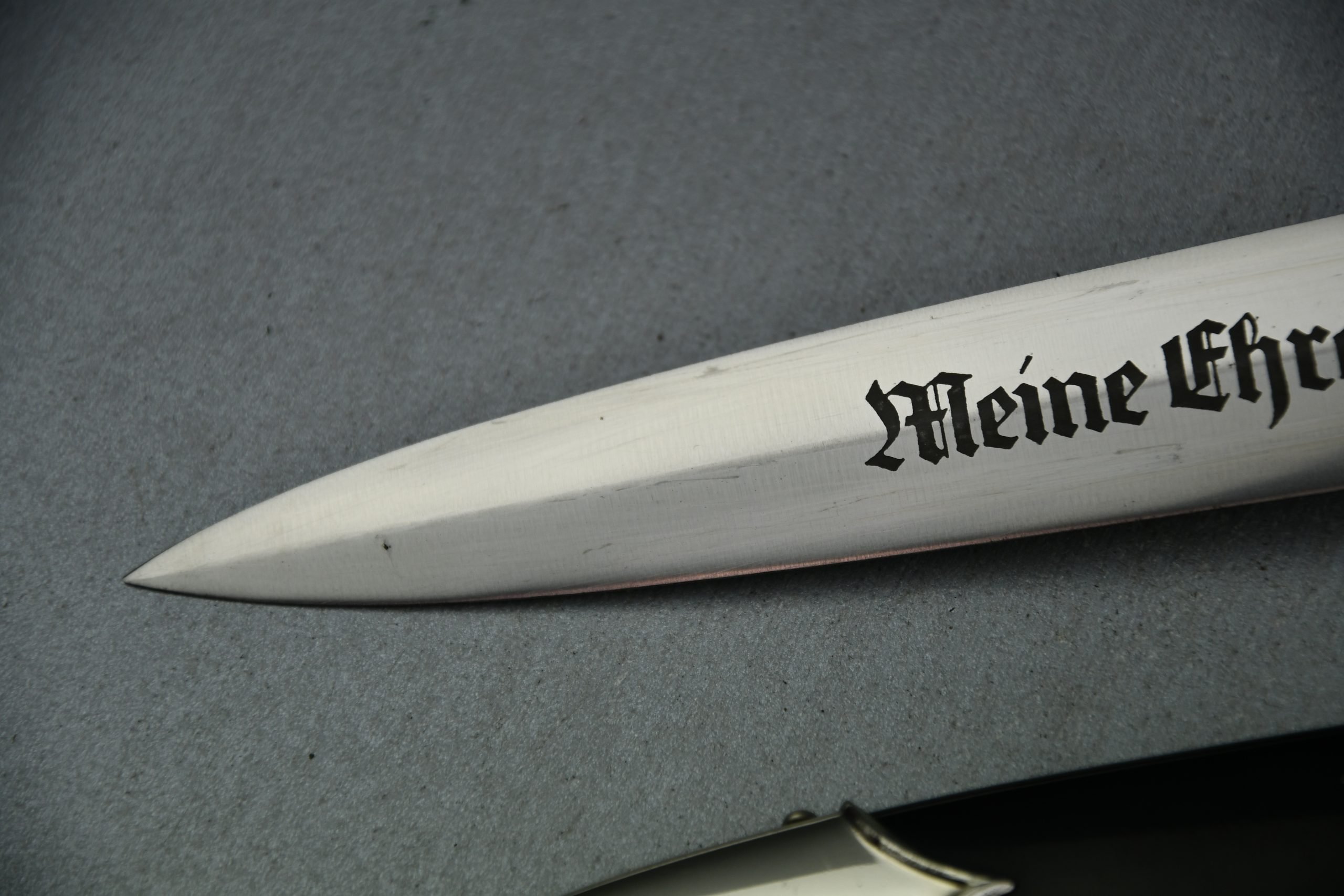 Stunning unworn โ MINT โ M33 pattern SS dagger in pristine condition. Blade is perfect, shows nice cross graining and only light runner marks. Maker marked by RZM 1052/38 SS, which is attributed to Pumawerk, Solingen, a rarely encountered manufacturer! Eagle on the grip shows nice patina and green patina. This is by far the best SS dagger I had in while that is so perfect and unissued โ impossible to upgrade this example.SHIPPING ONLY IN MAINLAND EUROPE โ COULD BRING THIS TO USA WHEN I FLY OVER
